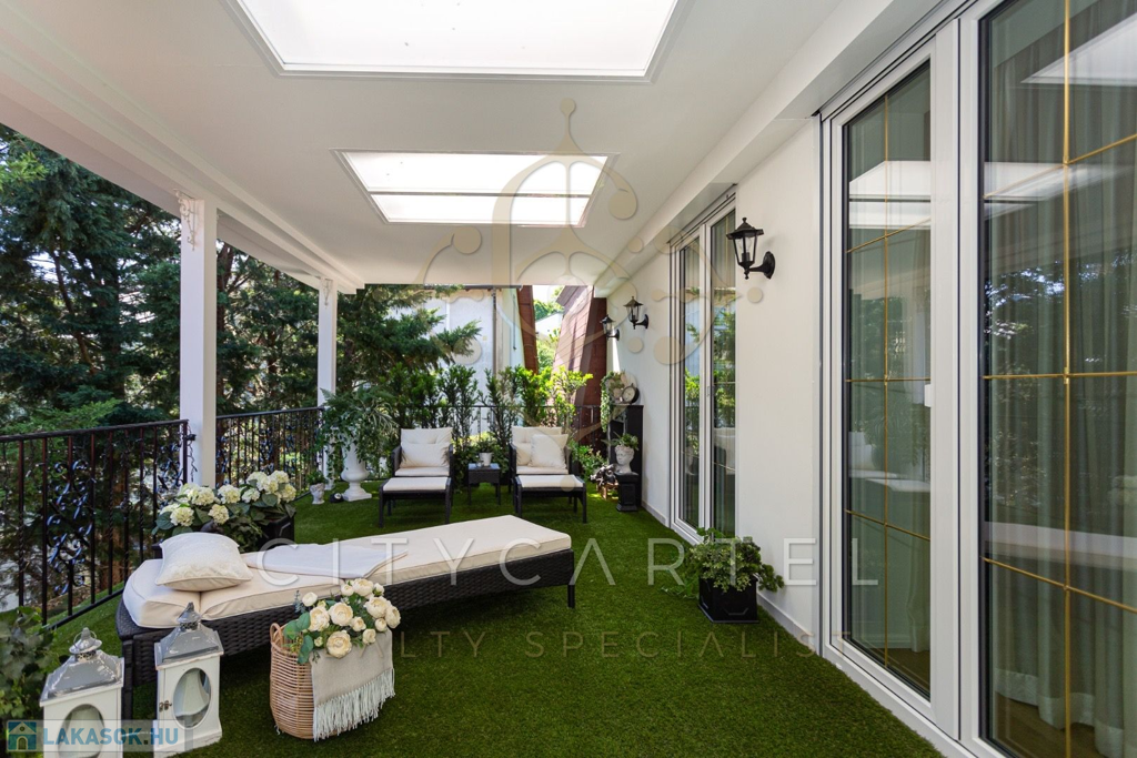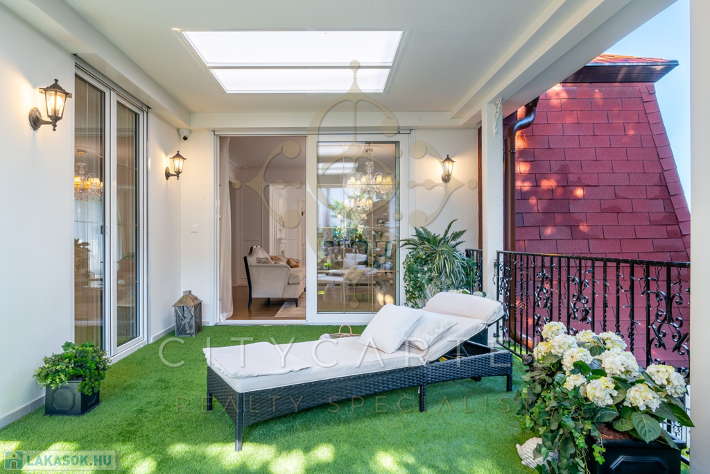 A luxuslakás felső emeleti elhelyezkedése, intim szeparáltsága és műfüves, hatalmas teraszai által olyan érzetet kelt, mintha egy exkluzív családi ház nyugalmát élveznénk.