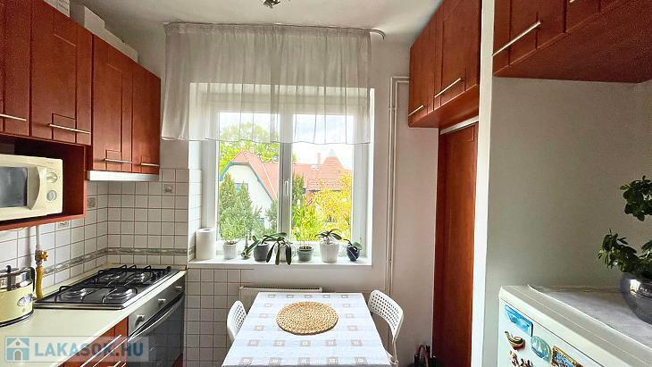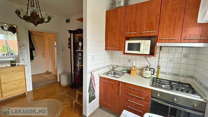 Konyhája rendkívül világos, könnyen szellőztethető és kamraszekrénnyel is rendelkezik.