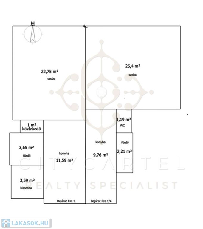 A bejáraton belépve a konyhába érkezünk, ahonnan balra található a kisszoba (3,5 nm) és a fürdőszoba, míg szemben a tágas nagyszoba (23 nm) kapott helyet.