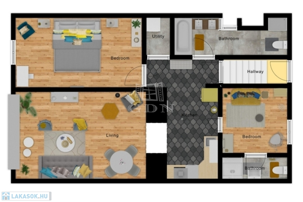 - Az előtérből nyílik a tágas, kádas–zuhanyzós fürdőszoba , a nagy ablakos utcai hálószoba, a kisebb háló saját zuhanyzós, WC-s fürdővel - ,