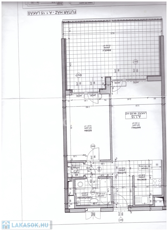 Tulajdoni lapon 45 m² lakótér (amerikai konyhás nappali és 2 háló) + 24 m² beépített erkély