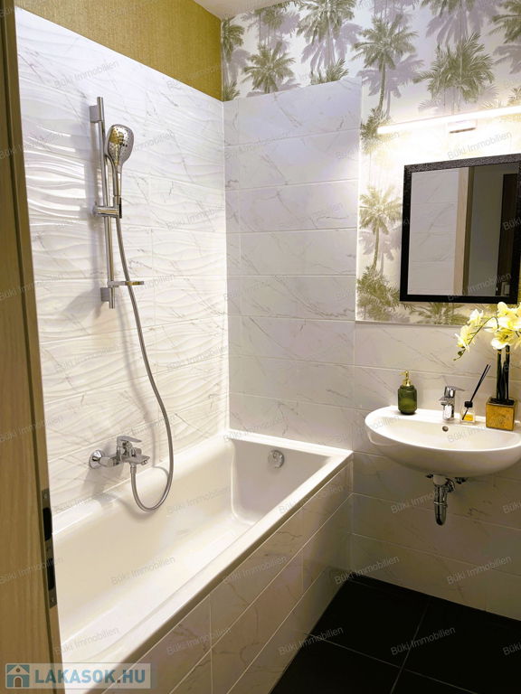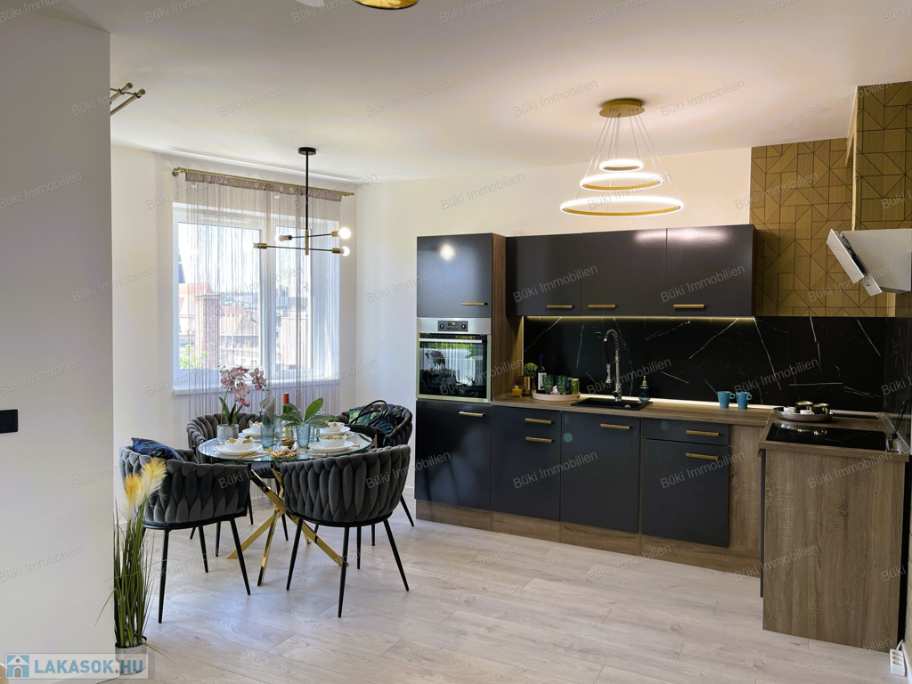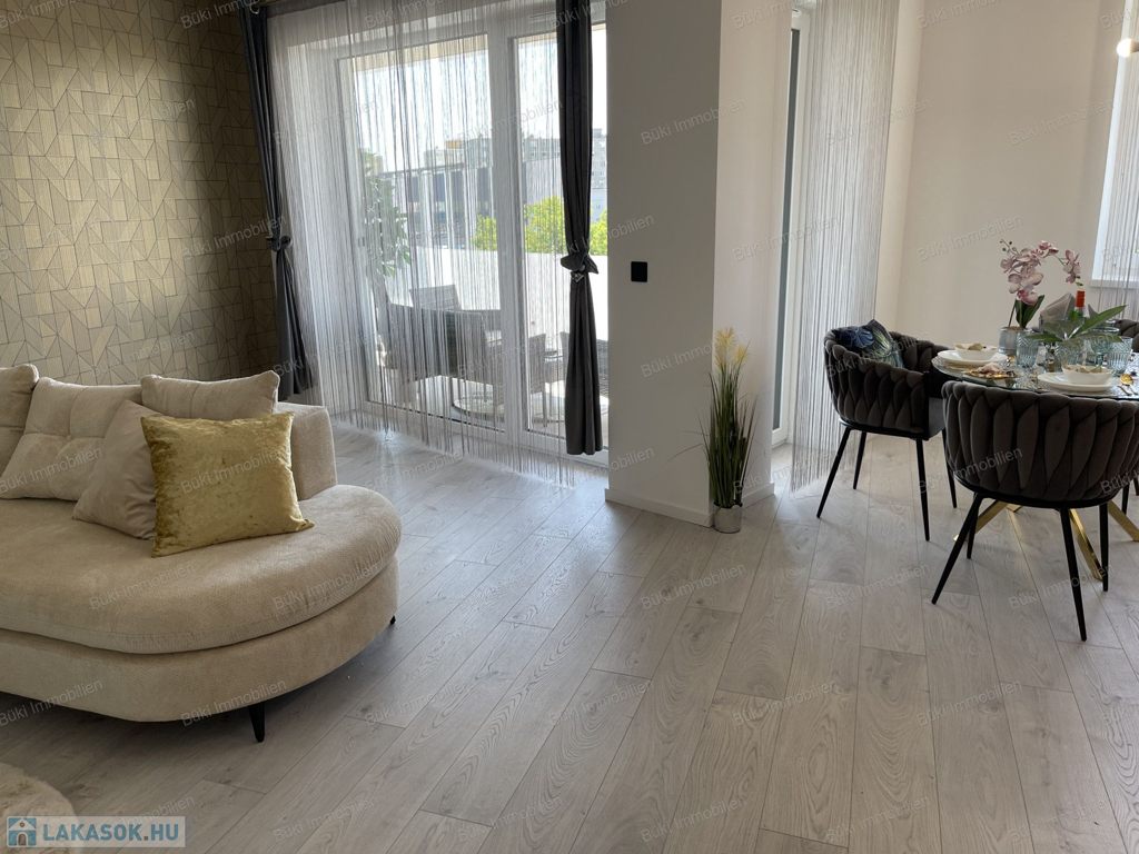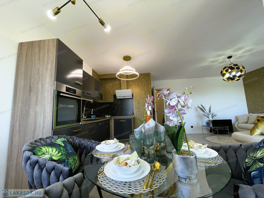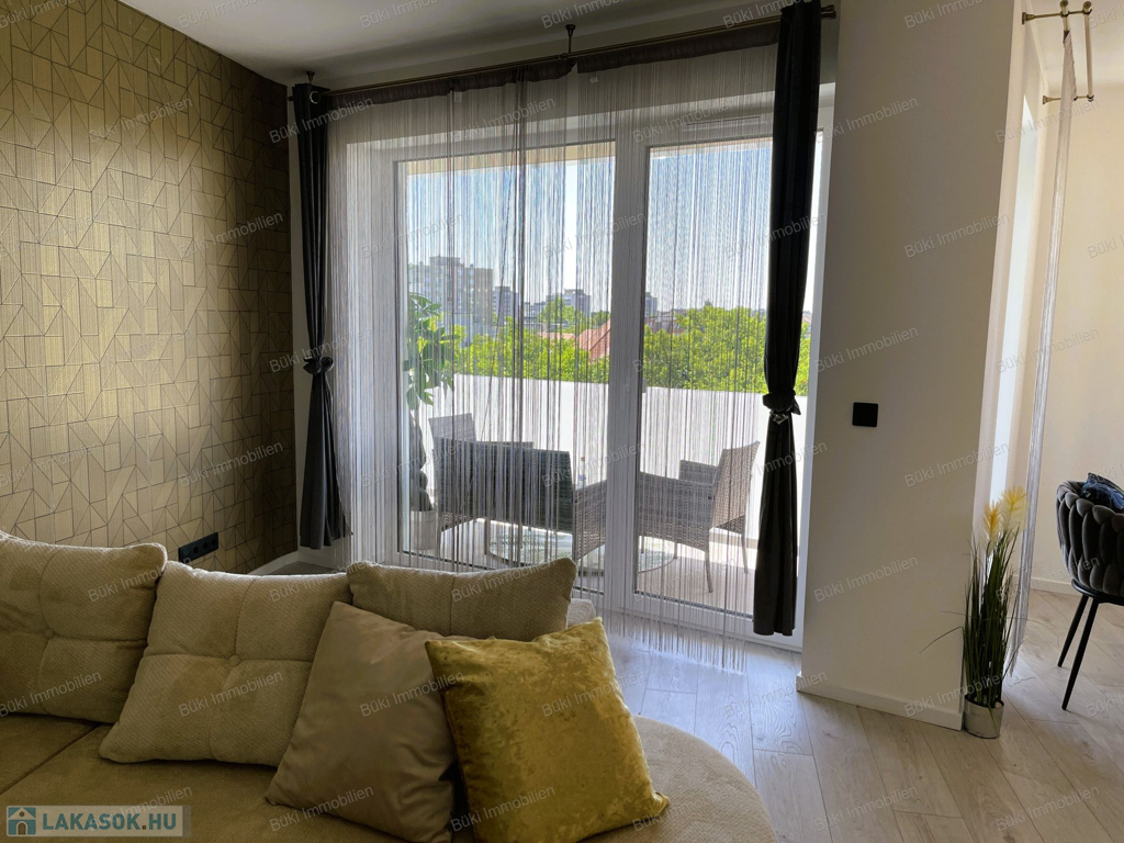 Itt van minden, ami csak egy igényes embernek kellhet a mindennapokhoz. Belsőépítész által tervezve, megalkotva, a legapróbb részletekre is ügyelve. Színvilágával elkápráztat, miközben az erkélyől a várost lehet csodálni, több szögből is. A bútorok egyedien lettek összeválogatva, a hideg és meleg színárnyalatokkal játszva, egy valódi alkotás. Ide már csak egy kulcsot, kistáskát kell hozni, és kezdőthet is egy új életszínvonal. Bárki, akit ide áthív az ember kávézni, borkóstolóra, vagy Netflixezni, biztosan elismerőleg fog szólni. A hatalmas erkélyen tavasztól mehet a teázás croissanttal, kis narancsdzsemmel és egy kis friss grapefruittal. Az erkély sarkon van, így a szívonalas zavartalan esti elmélkedés, esetleg a következő Nobel-díjas találmány megalkotása teljesen lehetséges, csak is a madarak lesznek jelen, mint hangulatfokozó természetes nyugatók. Wc és fürdő külön, így ha nagyobb társaság jönne össze, a házigazda zavartalanul mosakodhat, ha esetlegesen foglalt a wc.