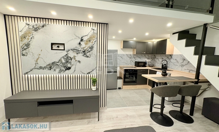 • „B” lakás: 32 m² + 11 m² galéria, teljesen berendezve és gépesítve, azonnal kiadható.