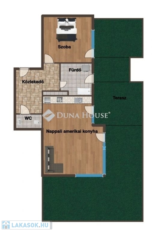 A lakás amerikai konyhás nappalival, és egy hálószobával rendelkezik.