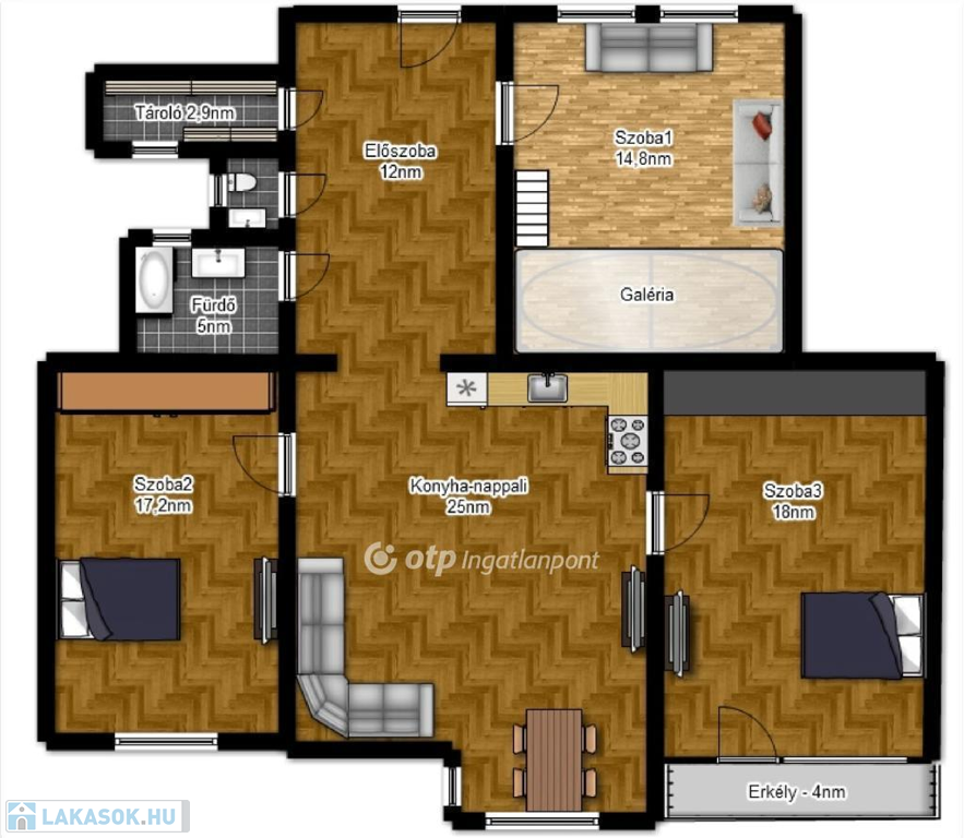 - 3 különálló hálószoba, 1 galériázott
