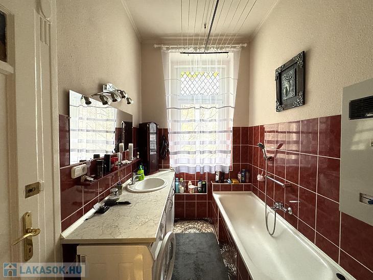 A fürdőszoba új burkolatot és kádat kapott, a mosógép kiállása itt található, valamint a WC egy külön helyiségben helyezkedik el.