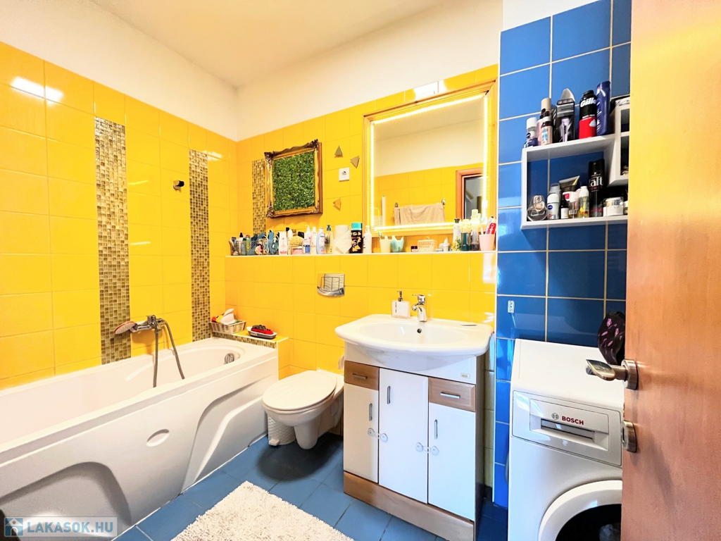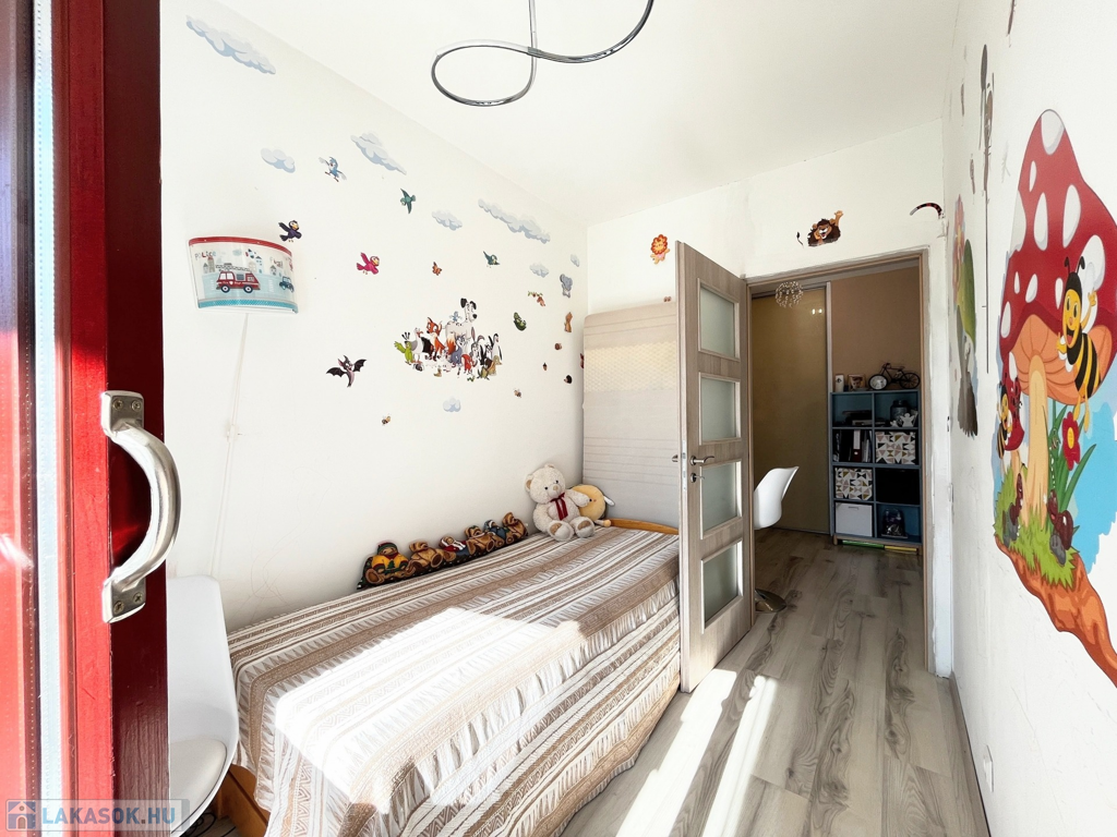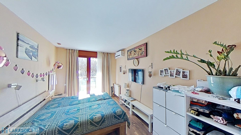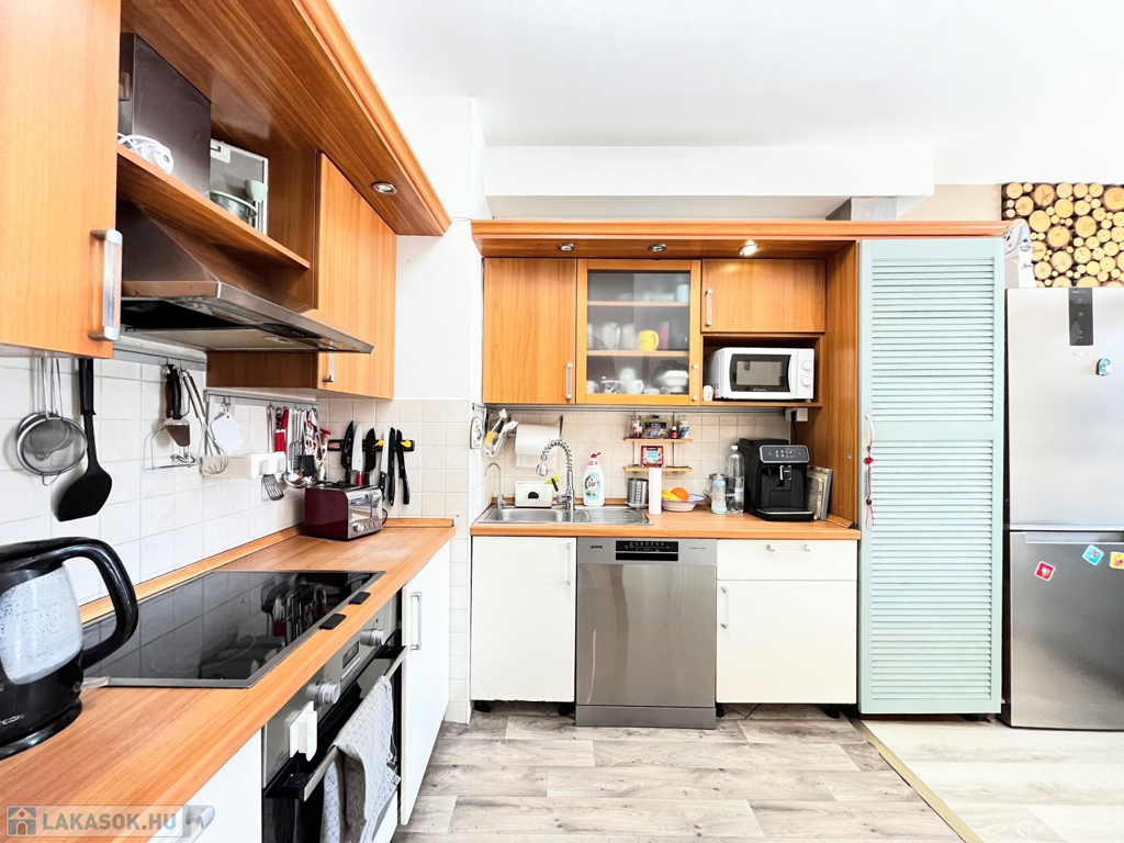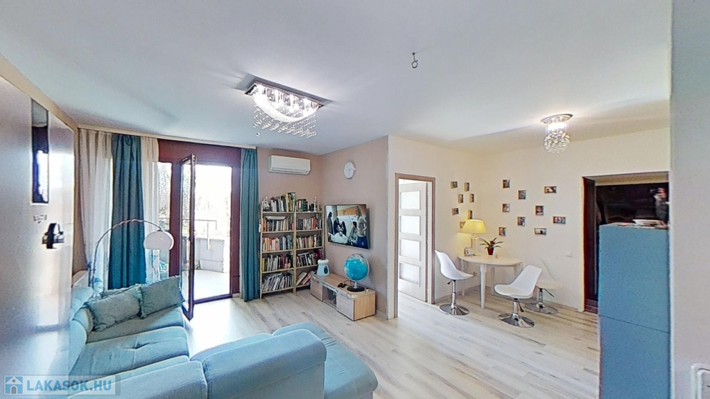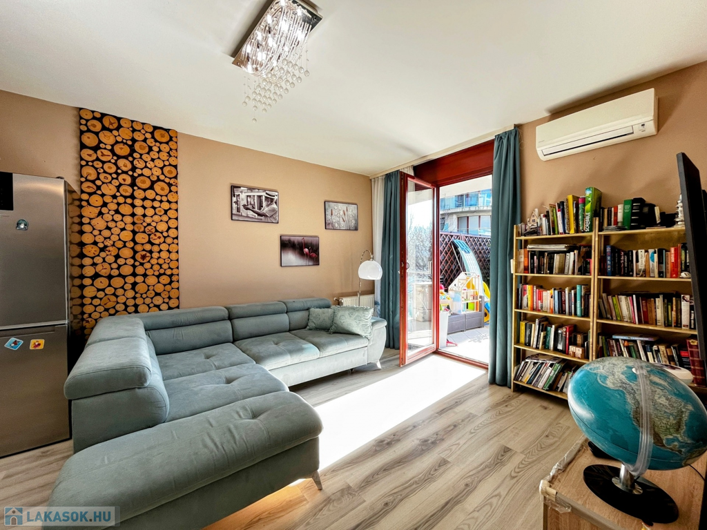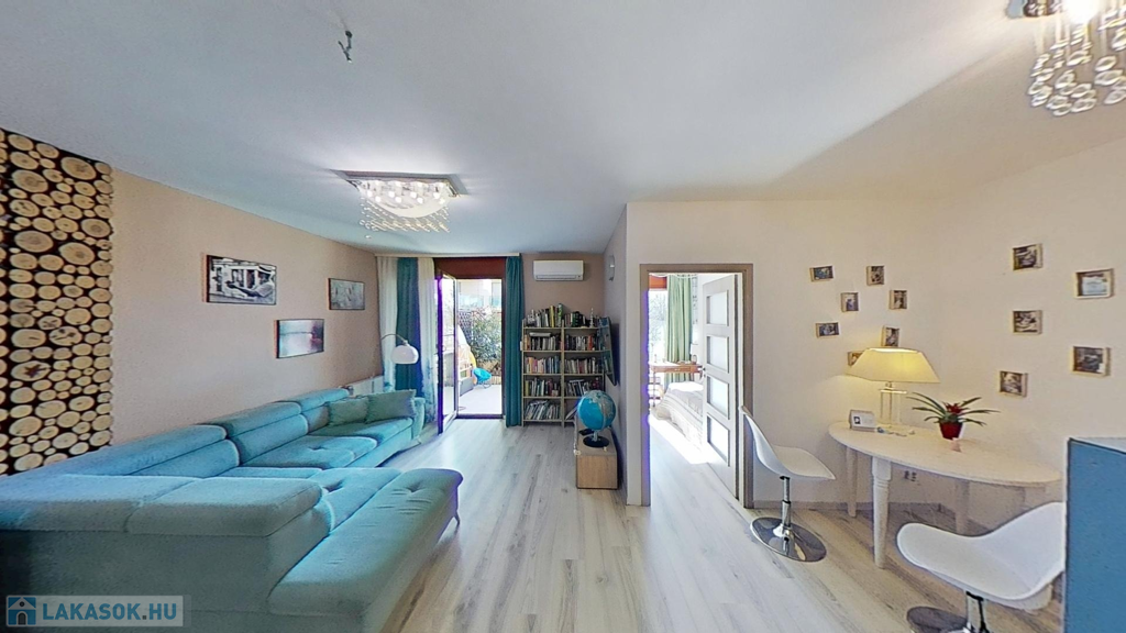 A lakásban a nagy, amerikai konyhás nappalin kívül két hálószoba várja az új tulajdonost. A kisebb háló utólag, a nappali területéből leválasztva lett kialakítva, így lehetőség van annak visszabontására, amivel a nappali még impozánsabb, világosabb lesz.