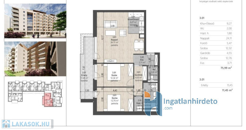 Elhelyezkedése: Társasház Emeleti elhelyezkedés: Emeleten Emelet száma: 3 Épület emeleteinek száma: 7 Tájolása: Déli tájolású Állapota: új Komfort besorolása: összkomfortos Építési éve: 2027 Alapterülete: 76 m2 Szobák száma: 3szoba Közművek: Víz, Villany, Csatorna Fűtés típusa: Padlófűtés, Fan-coil, Hőszivattyú Homlokzat állapot: új Építési mód: Tégla Parkolási lehetőség: Garázsban Kilátás: Udvari kilátás Napelem: Nincs Jellemzői: Alacsony rezsi, Csendes környék, Jó közlekedés Energetikai besorolás: A+ Egyéb jellemzők: Erkély, Lift Tv, Internet: Kábeltévé, Internet Terhelések: Tehermentes ingatlan Eladásra vonatkozó információk: Kizárólag magánszemélyek jelentkezését várjuk