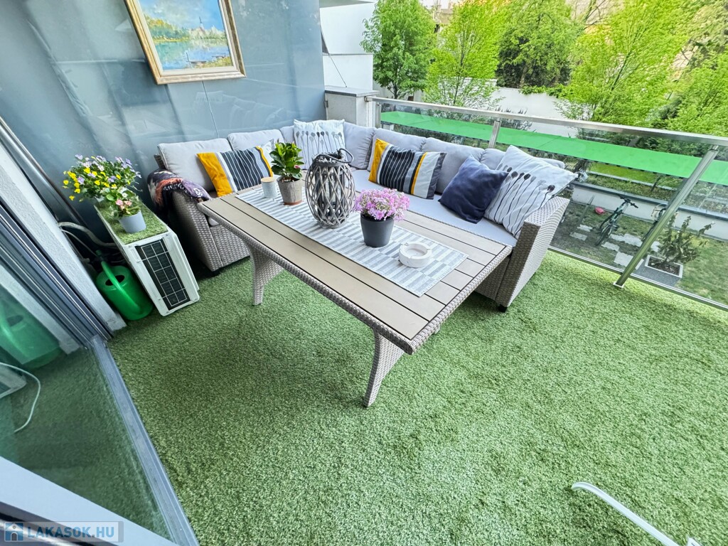 Méret és elrendezés: tágas, 69 m² alapterület. Az amerikai konyhás nappali tökéletes tér az egész család számára, innen nyílik egy hálószoba, hatalmas erkély, fürdőszoba és külön mellékhelyiség. A második hálószoba pedig folyosóról nyílik. Az ingatlanban kettő fürdőszoba van, az egyik folyosóról, a másik a hálószobából nyílik. Tökéletes elrendezés!