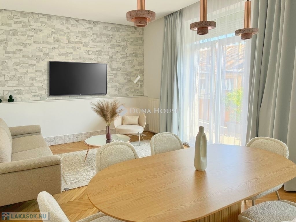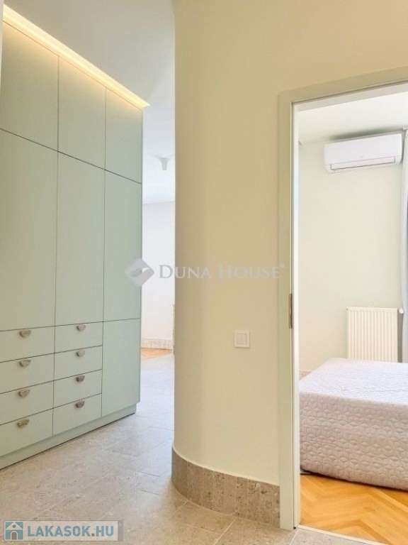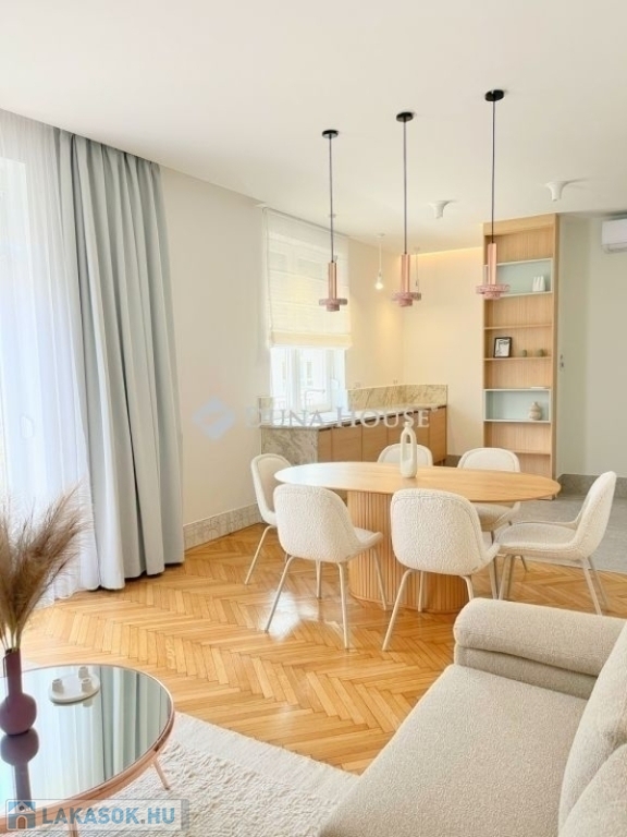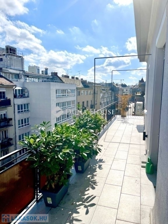 Újlipótvárosban, a Raoul Wallenberg utcában eladó egy 2024-ben teljeskörűen felújított, hatodik emeleti, 67 m²-es lakás 24 m²-es tetőterasszal a Phönix-házban.A lakás belsőépítész tervei alapján került felújításra és átalakításra. A nappali és a konyha-étkező egy tágas légtérben található, dupla erkélyajtóval a teraszra. A hálószobából szintén van kijárat a teraszra. Külön vendég WC helyiség került kialakításra.Az ingatlan főbb jellemzői: 24 m²-es, dél-keleti fekvésű tetőterasz panorámával; légkondicionálás a nappaliban és a hálószobában; egyedi beépített bútorok; BOSCH konyhai gépek (sütő, főzőlap, beépített mikró, mosogatógép, hűtő fagyasztóval); eredeti fa parketta; magas minőségű burkolatok; felújított és szigetelt tetőterasz; redőnyök; biztonsági bejárati ajtó; padlófűtés a hidegburkolatos helyiségekben.A társasház jó anyagi körülmények között van, jelenleg is folyamatban van a teljes elektromos hálózat felújítása. A lépcsőház és a lift korábban felújításra került.Az ár a teljes berendezést, bútorzatot és a gépeket tartalmazza.