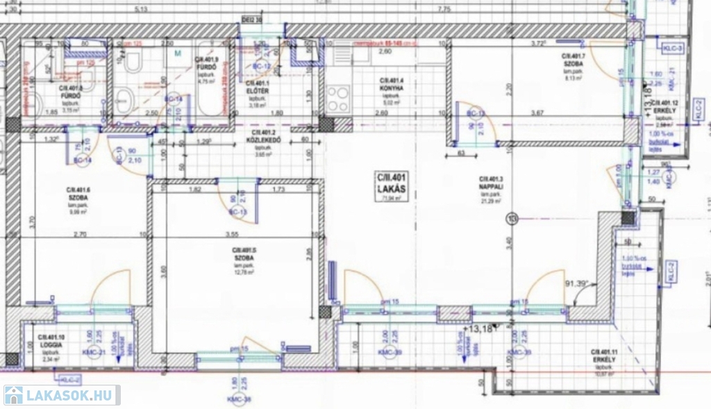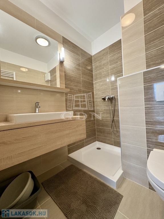 A lakás a 4. emeleten található egy 5 szintes társasházban, és összesen három terasz kapcsolódik hozzá, együtt 16 m² alapterülettel.