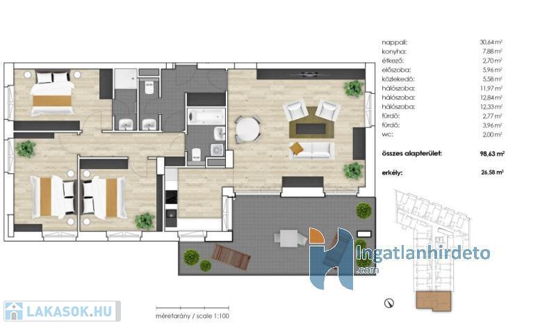 Elhelyezkedése: Társasház Emeleti elhelyezkedés: Emeleten Emelet száma: 3 Épület emeleteinek száma: 7 Tájolása: Déli tájolású Állapota: új Komfort besorolása: Dupla komfortos Építési éve: 2024 Alapterülete: 99 m2 Szobák száma: 4szoba Közművek: Víz, Villany, Csatorna Fűtés típusa: Padlófűtés, Fan-coil Homlokzat állapot: új Építési mód: Tégla Tető formája: Lapos Parkolási lehetőség: Garázsban Kilátás: Udvari kilátás Napelem: Nincs Jellemzői: Alacsony rezsi, Csendes környék, Jó közlekedés, Amerikai konyha Energetikai besorolás: A++ Egyéb jellemzők: Terasz, Pince, Lift Tv, Internet: Kábeltévé, Internet Közelben: Iskola, Óvoda, Közelben metró, Villamos, Autóbuszállomás, Helyi autóbuszállomás, Orvosi rendelő, Bolt, Gyógyszertár, Postahivatal, Vendéglátó egység, Autópálya Terhelések: Tehermentes ingatlan Eladásra vonatkozó információk: Kizárólag magánszemélyek jelentkezését várjuk