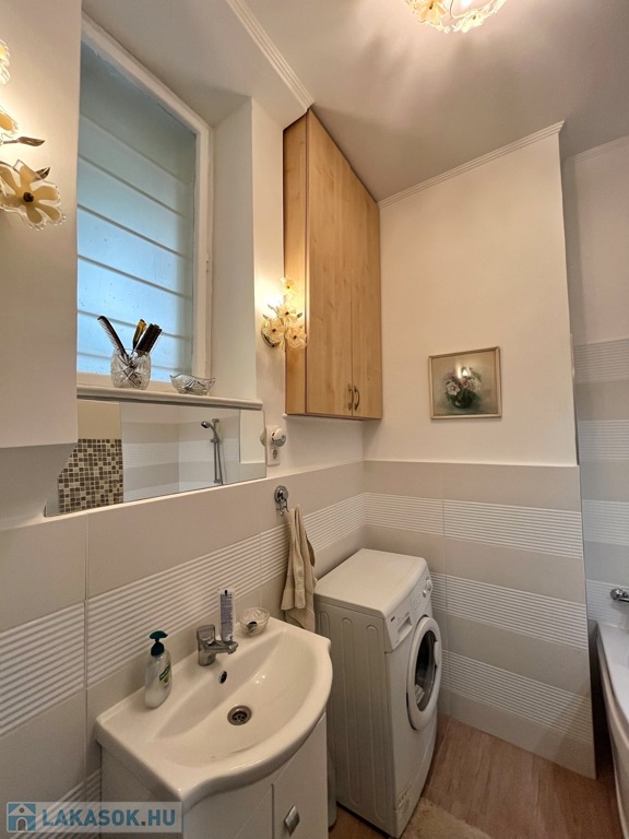 A fürdőszoba kifogástalan állapotú, kényelmes káddal felszerelt.