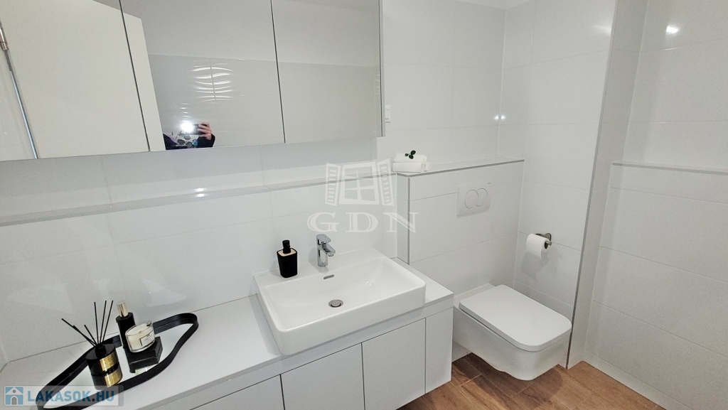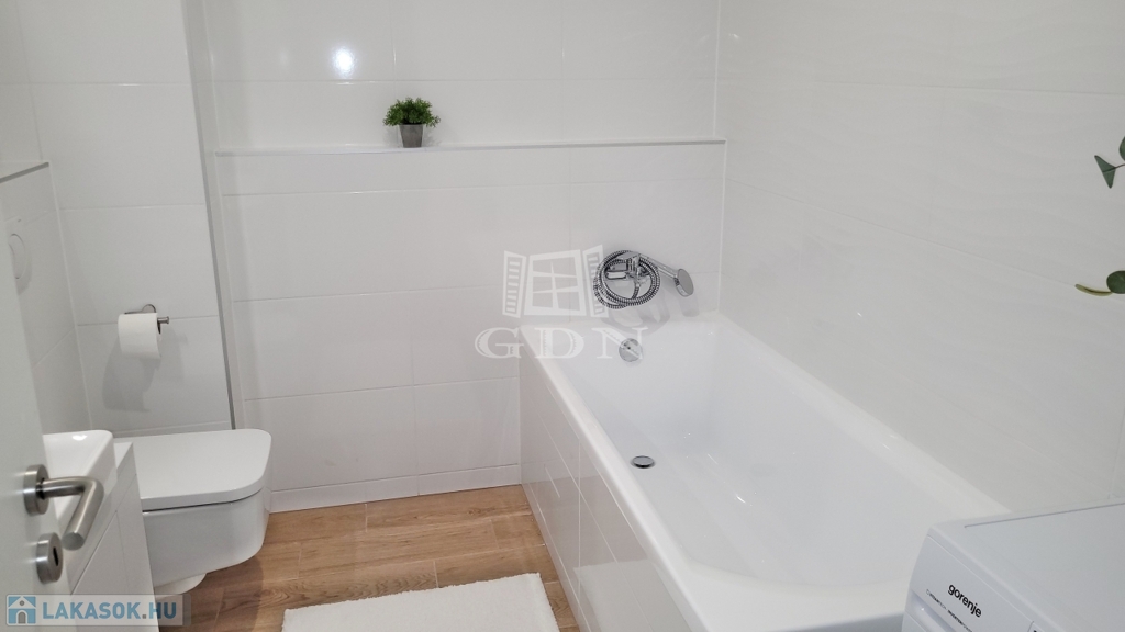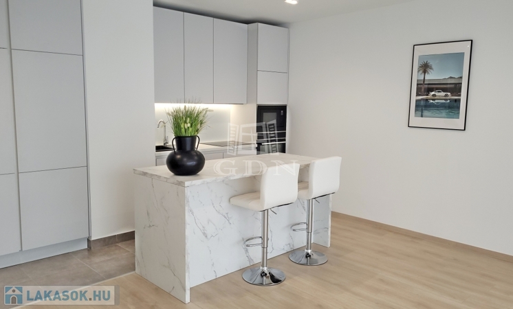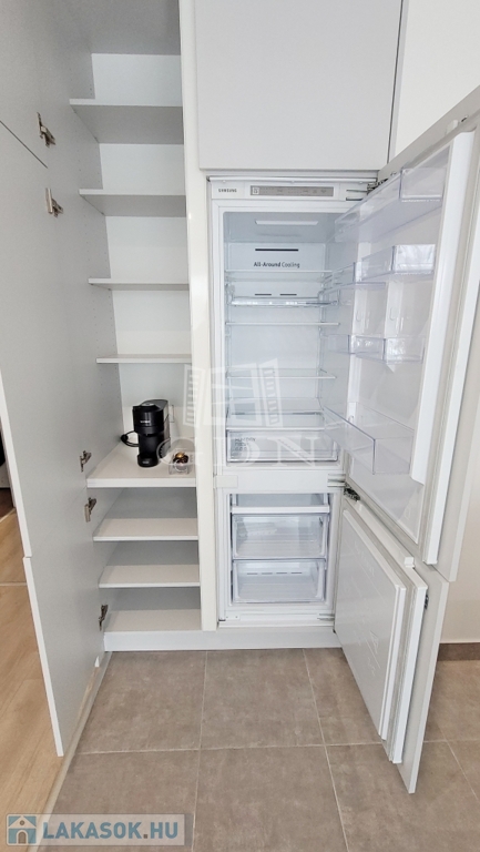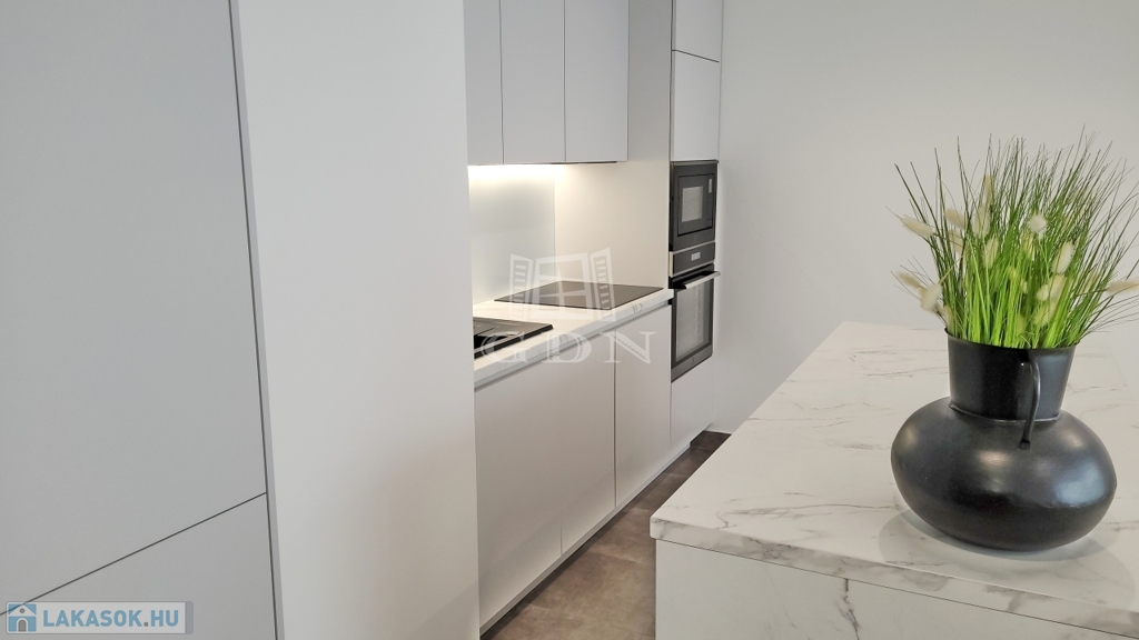 Beépített előszoba, - fürdőszoba (mosógéppel) és konyhabútorral, plusz gépek (sütő, főzőlap, mikrohullámú sütő, szagelszívó, hűtőgép és fagyasztó. Konyha sziget.