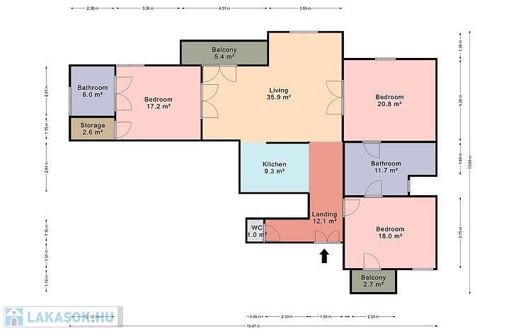 Az ingatlan tágas, jól átgondolt elrendezésű: 4 külön nyíló szoba, 2 fürdőszoba, valamint 2 WC (ebből az egyik külön helyiségben) biztosítja a kényelmet akár nagyobb család számára is. A lakás különlegessége a két erkély, melyek közül a nagyobb az utcára, a kisebb a csendes belső udvarra néz.