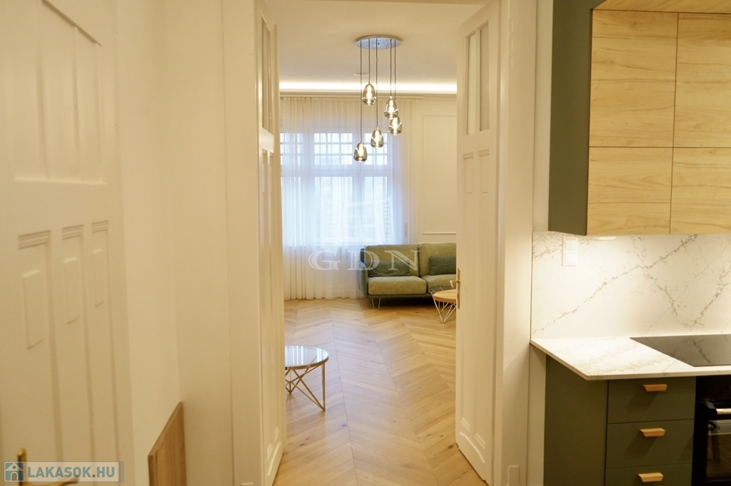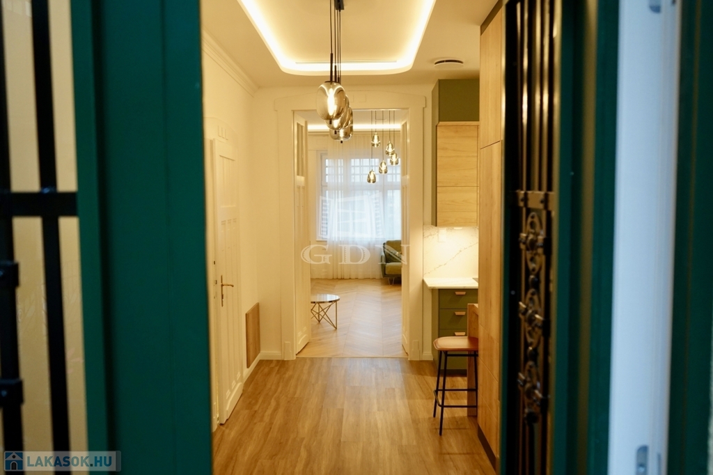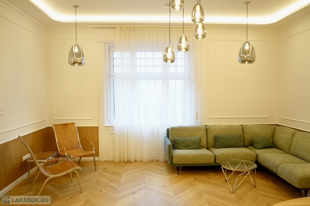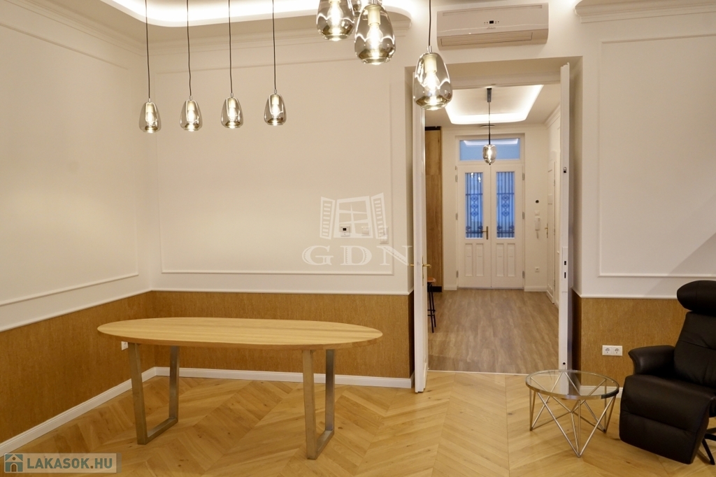 A 3,2 méteres belmagasság, a klasszikus halszálkamintás tölgyfa parketta és a felújított, patinás beltéri ajtók időtálló nagypolgári hangulatot teremtenek, amely harmonikusan kapcsolódik a modern megoldásokhoz. Az enteriőr kifinomultságát designlámpák és gondosan kiválasztott burkolatok erősítik, egységes és elegáns összképet alkotva.