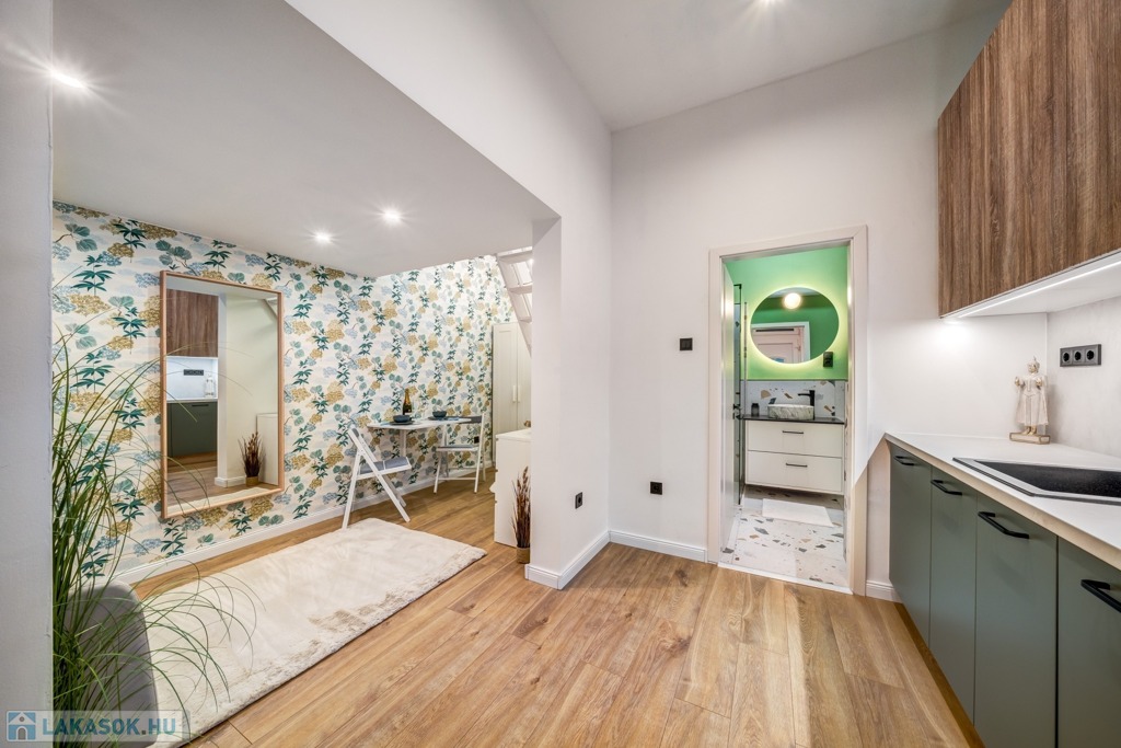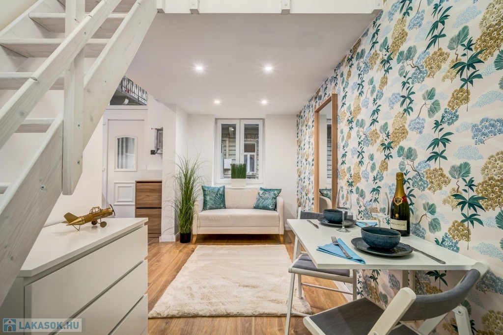Az eladásra kínált lakás 21 nm alapterületű, amelyet egy 5 nm-es fekvőgaléria tesz még praktikusabbá és kényelmesebbé. A galérián új, 140 cm széles matrac biztosít pihentető alvást.