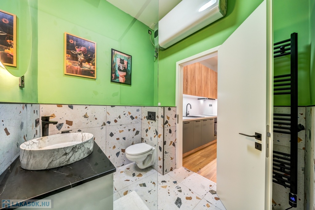 A lakás minden eleme tejleskörű felújításon esett át, így valóban 0 km-es állapotban kerül átadásra: megújult a teljes villamos- és vízhálózat, új burkolatokat, nyílászárókat és szerelvényeket kapott, valamint egyedileg gyártott, modern konyhabútorral szerelték fel. A háztartási gépek – köztük az AEG főzőlap, az Electrolux sütő és hűtő, illetve a Gorenje mosogatógép és páraelszívó – mind vadonatújak és garanciálisak, ahogyan a lakás teljes bútorzata és matraca is. A gránit mosogató tovább erősíti a minőségi kialakítást. A fűtést és hűtést inverteres klíma biztosítja, míg a melegvíz ellátásáról Ariston bojler gondoskodik.