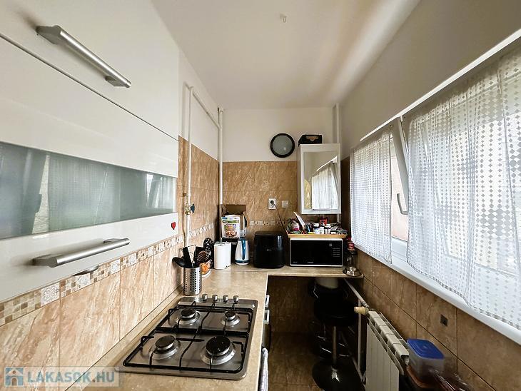 A konyhája ablakos, valamint új konyhabútorokkal rendelkezik.