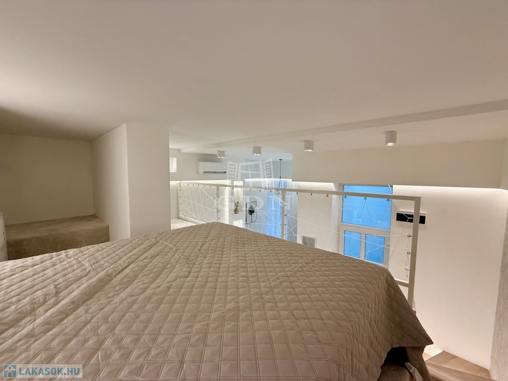 A koncepció lényege az élhető tér kis alapterületen. A megfelelő belmagasság lehetővé tette a galériás kialakítást, így a nappali és hálófunkció elkülönül, ami érezhetően javítja a használhatóságot és a kiadhatóságot. Az anyaghasználat, a burkolatok és a gépészet nem kompromisszumos megoldások: tartós, időtálló, karbantartható elemek kerültek beépítésre.