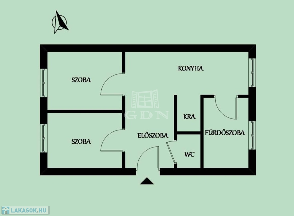 • Elosztás: 2 szoba, konyha, fürdőszoba, WC, folyosó