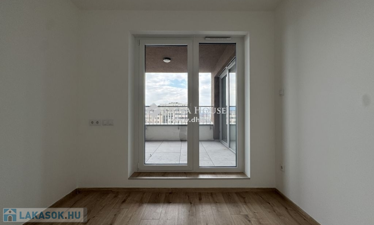 Angyalföldön!Ritka lehetőségként kínálunk eladásra A főváros egyik legnépszerűbb, gyorsan fejlődő, csendes részén, a Xlll. kerületi, közkedvelt New Palace lakóparkban, egy, újépítésű, 35 nm alapterületű, rendkívül átgondolt, jó elrendezésű, világos, terasszal rendelkező, 6. emeleti, nappali + 1 szobás, gyönyörű studio lakást.A lakás 2025 szeptemberére lesz beköltözhető. Teljeskörűen, a tervek szerint, magas minőségben megvalósítva. Az előszobából egy rövid közlekedőn érhető el az a kicsi de élhető méretű, északi irányba néző, hatalmas teraszajtónak köszönhetően, a nap legnagyobb részében szép, világos nappali, ahol helyet kapott egy kompakt konyha is. Innen nyílik a szintén északi fekvésű hálószoba is csendet és intimitást biztosítva az alváshoz. Szintén az előszobából megközelíthető egy minden komfortot kielégítő fürdőszoba is, ami Wc-vel és egy épített zuhannyal került kialakításra. A federt terasz, ami a nappaliból és a hálószobából is megközelíthető, alkalmas, grillezésre, vendégfogadásra, északi tájolásnak köszönhetően, kellemes, árnyékos, így a nyári kánikulában is rendkívül élhető. Valamennyi burkolat, prémium kategóriás. Az épületben biztonsági kamerarendszer működik. A lakás pedig távfelügyeletre alkalmas riasztórendszerrel felszerelt. A nappali és a szoba is, külön szabályozható klímarendszerrel rendelkezik. Belmagasság: 2,7 m.Az ingatlan rendkívül alacsony fenntartási költségű. Egyedi mérőórás, házközponti gázkazán, mennyezeti hűtő—fűtő rendszer gondoskodik a fűtésről és a melegvízellátásról, melynek összege rendkívül alacsony havonta, A közös költség pedig magában foglalja az összes házzal kapcsolatos egyéb költséget. A társasház rendelkezik megtakarítással, illetve, biztosítással is, a közös képviselet gondosan kezeli a ház ügyeit.A Lakópark elhelyezkedése kiváló, autóval a Váci útnak köszönhetően, bárhová gyorsan el lehet jutni, de tömegközlekedéssel is jól megközelíthető, sétatávolságra 3-as Metro Gyöngyösi utcai megállója, buszmegállók, illetve az Újpest vasútállomás. Valamint, néhány perces sétatávolságra található Duna Plaza bevásárlóközpontnak, Aldinak, Sparnak, Lidl-nek, valamint a Népsziget és a gyöngyösi sétány és újpest központjának közelsége miatt biztosított számos bevásárlási, kikapcsolódási és sportolási lehetőség. A körzetes óvoda és általános iskola szintén 10 perces sétával elérhető.Az ingatlan, új építésű, állapotát tekintve, teljesen, kifogástalan állapotú, nyár végén költözhető. Kialakítása és a lakópark által biztosított csendes, kellemes környezete miatt kitűnő választás otthonnak de akár, értékálló befektetésnek is.Az utcában, ingyenes a parkolás. Illetve a lakáshoz opcionálisan vásárolható, teremgarázs beálló épületen belül a pinceszinten.