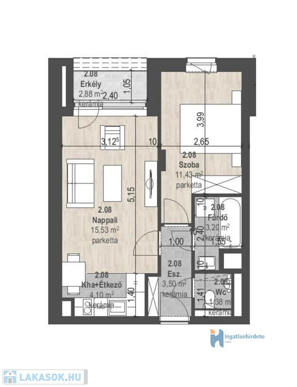 - fűtése: levegős hőszivattyús rendszer (padlófűtés, Fan-coil hűtés)