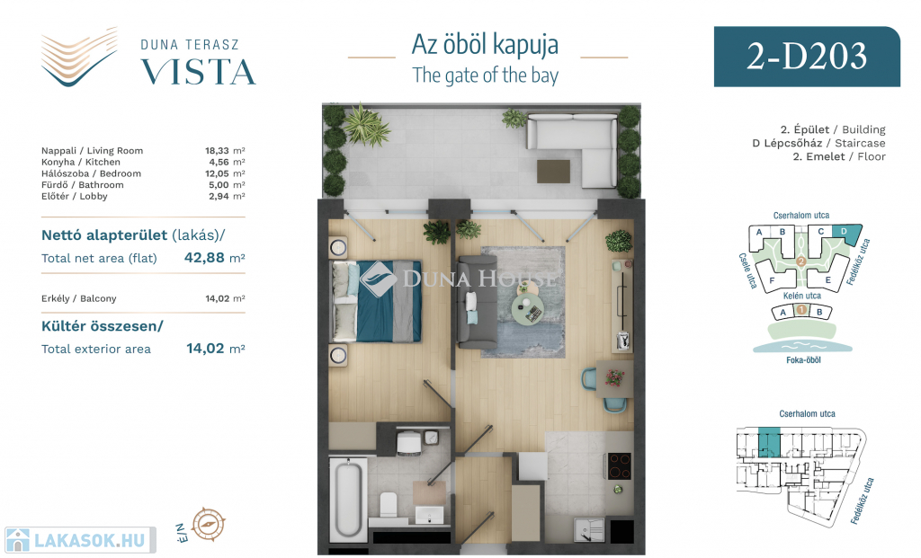 Az Öböl Kapuja!Eladó egy 2 szobás, napfényes, 43m²-es lakás 14 m² erkéllyel Budapest egyik legexkluzívabb fejlesztésében, a Marina parton. Az ingatlan utcára néző, világos, modern kialakítású, ideális rövid- vagy hosszú távú bérbeadásra, illetve értékálló befektetésnek.-Tervezett átadás 2026 szeptemberA projekt különlegessége a vízparti elhelyezkedés, a lenyűgöző dunai panoráma, valamint a modern, hullámzó homlokzati kialakítás. A korlátozottan elérhető Duna-parti ingatlanok értéke évről évre jelentős mértékben növekszik, keresettségük miatt gyorsan és könnyedén bérbe adhatók akár prémium hozammal.Műszaki és kényelmi jellemzők:Energiatakarékos mennyezeti hűtés-fűtésRecepció, portaszolgálat és csomagpontMagas színvonalú építési minőségKözösségi szolgáltatások:Tetőteraszok napozóval, jóga- és grillfunkcióvalKözösségi nappali, kültéri és beltéri játszótérFűszerkert, pihenőpark, outdoor officeSporteszköz- és fészerraktár, kerékpártárolókPorta- és őrszolgálatLokáció és elérhetőség:A lakópark a Vizafogó városrészben épül, amely az elmúlt évek egyik legdinamikusabban fejlődő területe.Pár perc sétára a Duna-part, Marina sétány, teniszpályák, játszóterek, éttermek, kávézók, kikötők és kültéri edzőtermek.Közlekedés szempontjából is ideális: a 3-as metró, buszok, bicikliút és hajókikötő is könnyedén elérhető így a belváros akár hajóval is megközelíthető.
