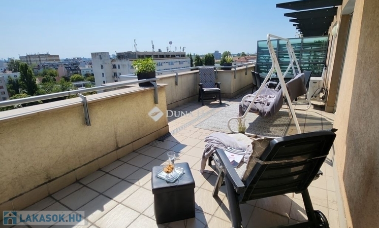 Modern, különleges penthouse lakás a 13. kerületben, - 180°-os panorámával és kiváló közlekedéssel!Eladásra kínálunk egy bruttó 72 m²-es, keleti tájolású, 8. emeleti penthouse lakást Budapest XIII. kerületében, a Lehel út centrumában, a Béke téren.Az ingatlanból lenyűgöző 180°-os panoráma tárul elénk, amely napfényes és tágas térélményt biztosít.Főbb jellemzők:-Penthouse jelleg, 180°-os panorámával, tágas terasszal- Keleti tájolás napfényes belső terek- Kiváló közlekedés: busz, villamos megállók az épület előtt- A lakás nettó 39 nm-es, a terasz 33 nm, tulajdoni lapon 55 nm!A modern elrendezésű, világos otthon B energetikai besorolással rendelkezik, így rezsiköltsége alacsony.Az ingatlan a képeken látható bútorokkal együtt eladó.A lakóközösség csendes és barátságos, így garantáltak a nyugodt és kellemes mindennapok.Az ingatlan az első otthonvásárlást támogató program keretében 3%-os kamatozású hitellel is megvásárolható, így kiemelkedő lehetőséget nyújt azoknak, akik saját, prémium otthont keresnek kedvező feltételekkel.Ez a lakás ideális választás mindazok számára, akik értékelik a modern városi életstílust, a panorámát és a kiváló közlekedést.