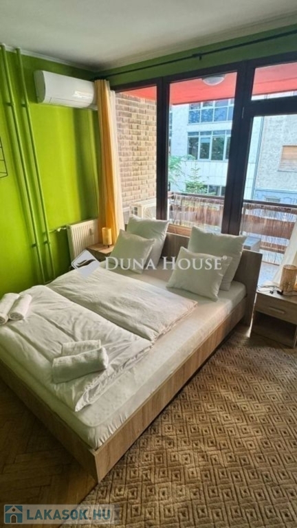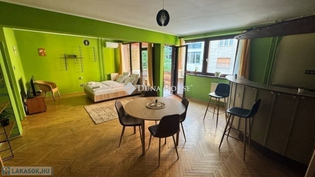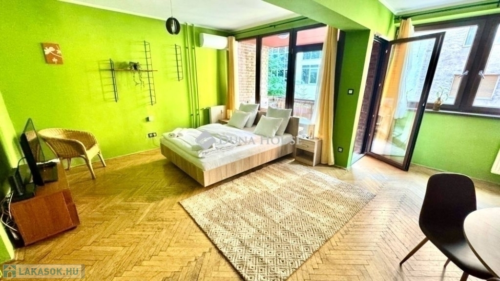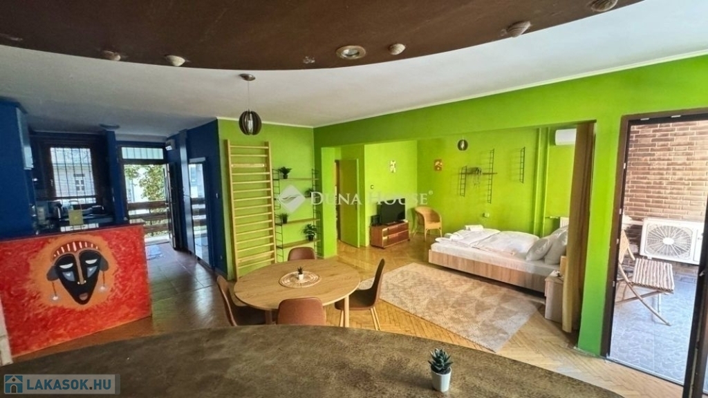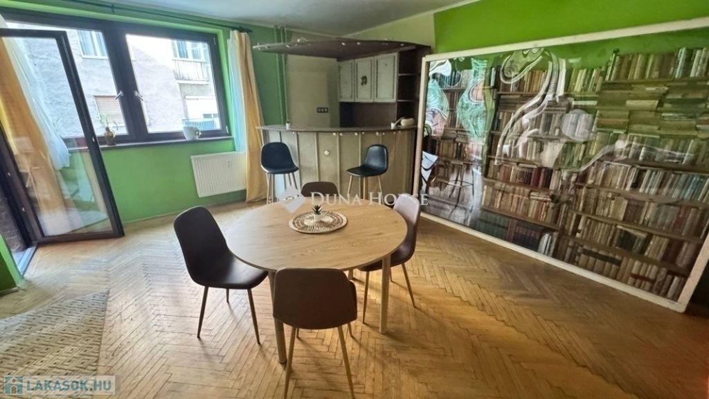 egy 63m2-es, déli fekvésű, nagyrészt csendes közre néző, napfényben úszó, tágas terekkel rendelkező, 1. emeleti lakás. 2017-ben volt felújítva, ekkor ki lettek cserélve a külső nyílászárók, és teljes villanyvezeték rendszer. Egy festés, és némi esztétikai felújítás után költözhető állapotú. Jelenlegi beosztását tekintve, egy nagy nappalival és egy hálóval rendelkezik, de könnyedén kialakítható még egy háló, ahogy eredetileg volt. Akár rendelőnek vagy irodának is kifejezetten alkalmas.