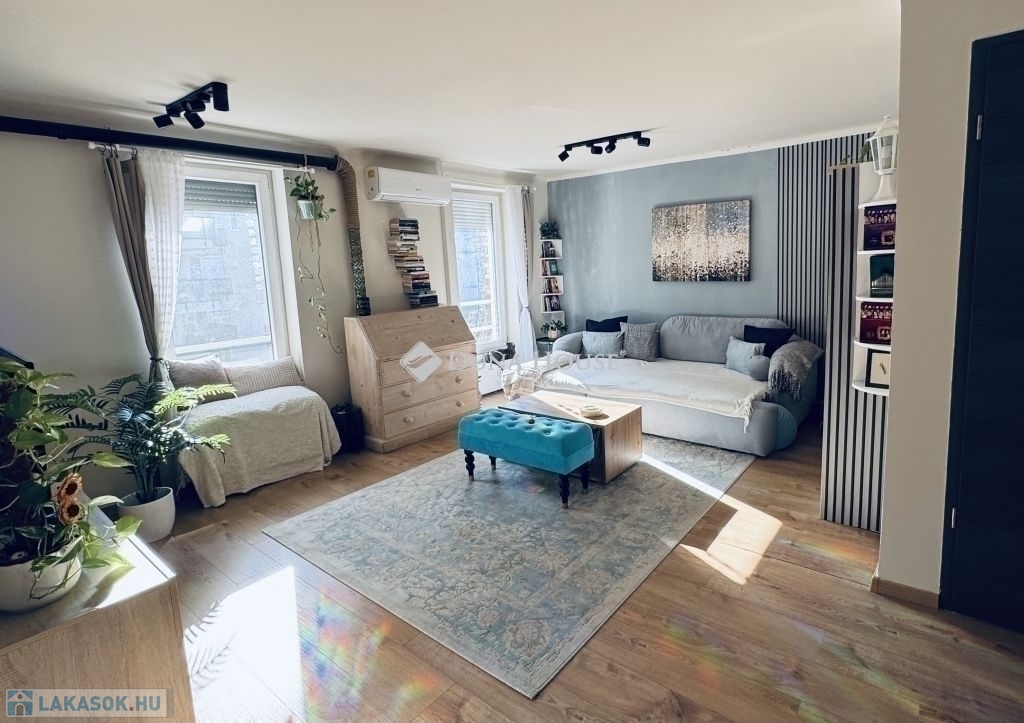 Hűtő-fűtő klíma, okosbojler, majdnem földig érő szúnyoghálós, redőnyös ablakok.