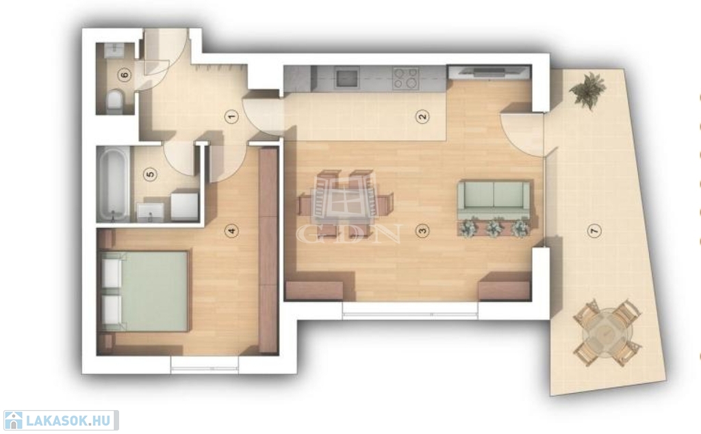 Ez a 2 szobás lakás 55nm alapterületű, tartotik hozzá egy 15nm-es terasz is.