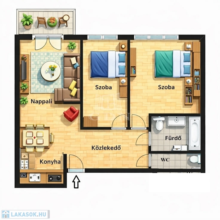 A tágas amerikai konyhás nappali közvetlen kapcsolatban áll az 5 nm-es erkéllyel, amely kellemes kikapcsolódást nyújt a mindennapokban.