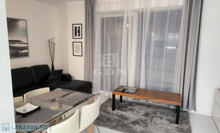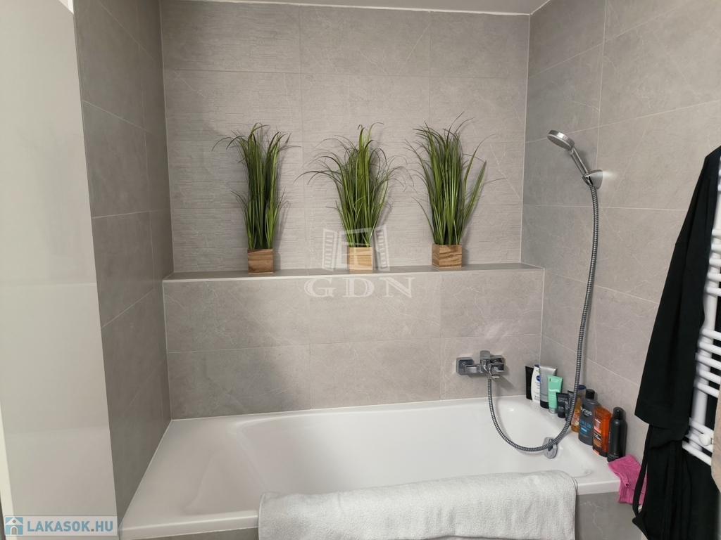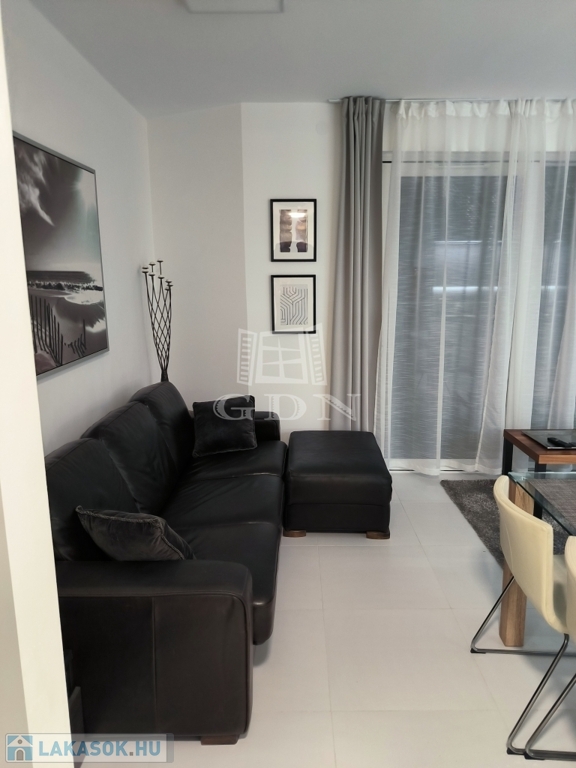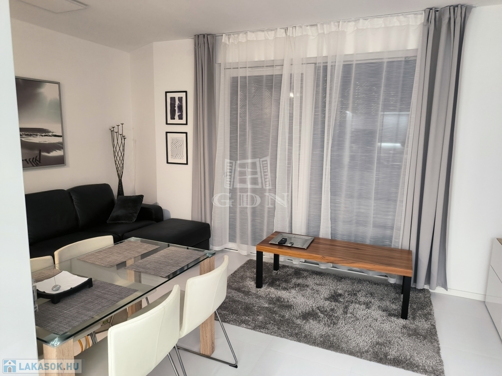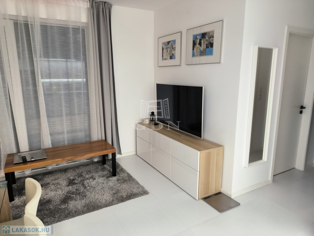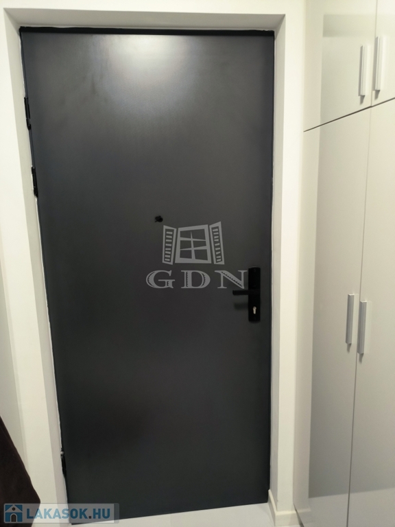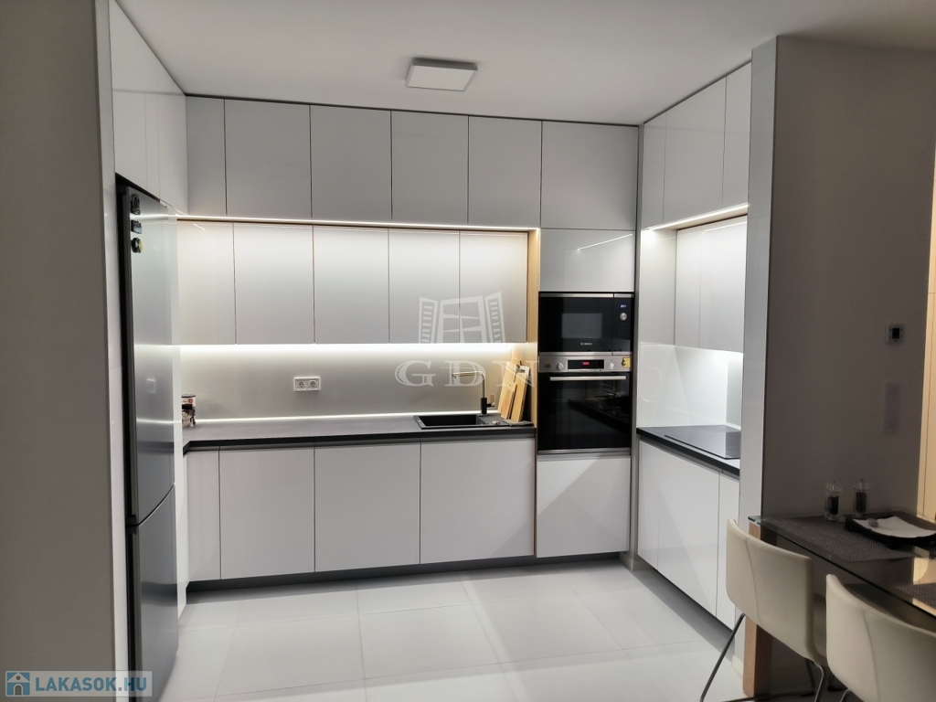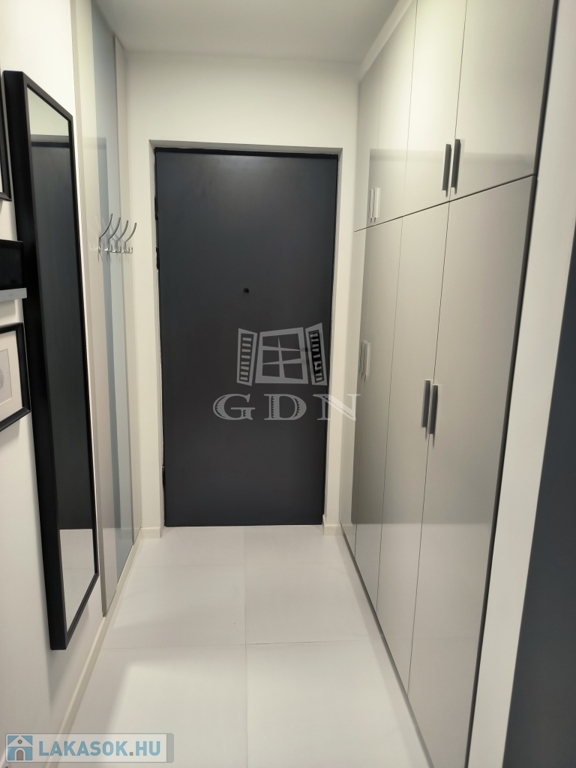 A lakásban az újszerű amerikai konyhás nappaliban beépített konyhabútor, az előszobában pedig előszobaszekrények találhatók, valamint fehér fényes, csillogó járólapok vannak ahonnét a nappaliból és a közlekedőből fürdőszoba és a WC nyílik .