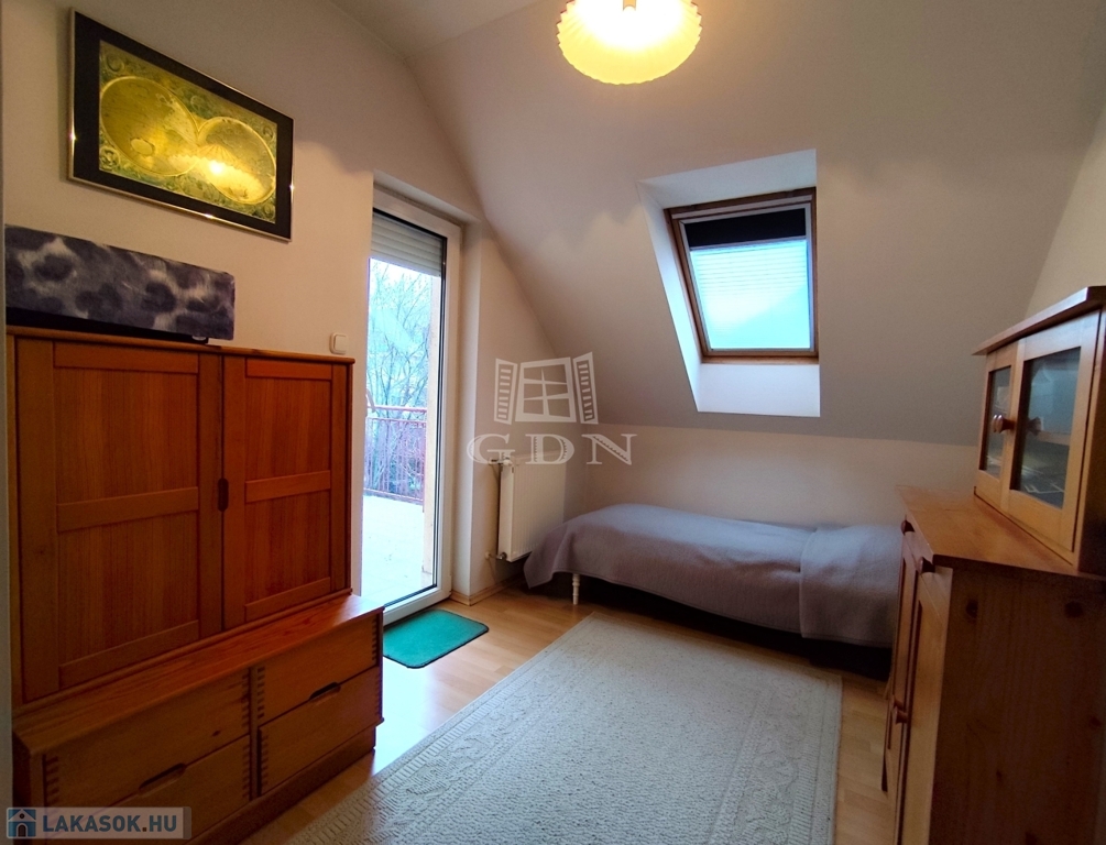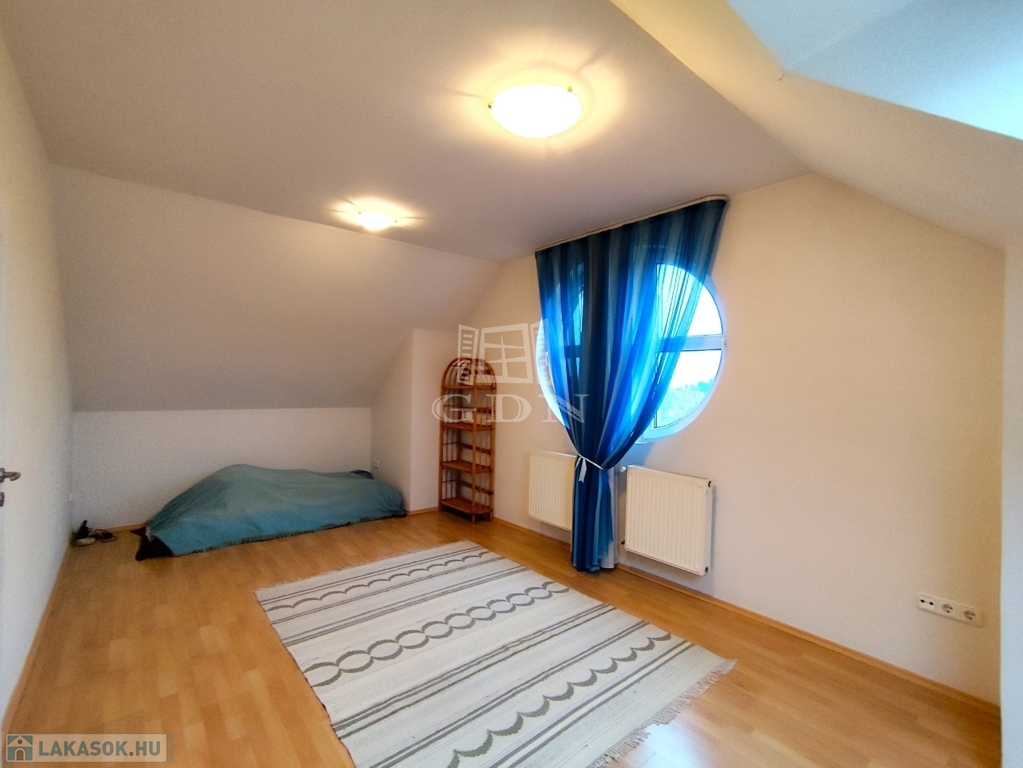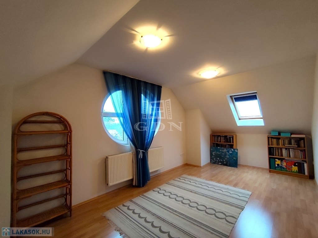 A tetőtéri szint igazi pihenőzóna. Jelenleg egybenyitott hálótérként funkcionál, de két külön gyerekszobává vagy háló + gyerekszoba kombinációvá is könnyen visszaalakítható.