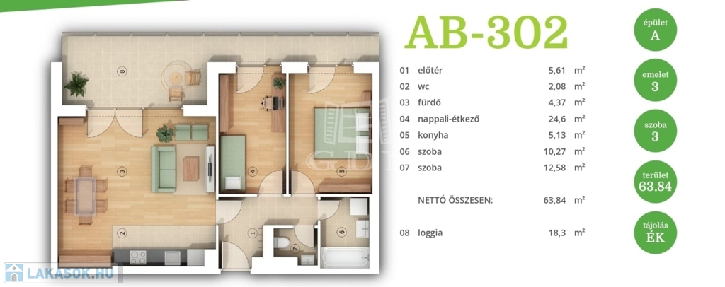 Ez a lakás nappali+2 hálós, 64nm alapterületű és tartozik hozzá egy 18nm-es terasz is.