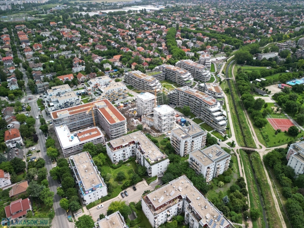 A két épületből álló beruházás során összesen 140 lakás épül, melyek izgalmas vonalvezetésű erkélyei segítik a többlakásos épület harmonikus illeszkedését a ligetes park és a megújult Rákos-patak által létrejövő környezetbe.