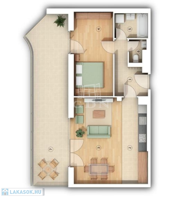 Ez a lakás nappali+1 hálós, 59nm alapterületű+ tartozik hozzá egy 29nm-es terasz is.
