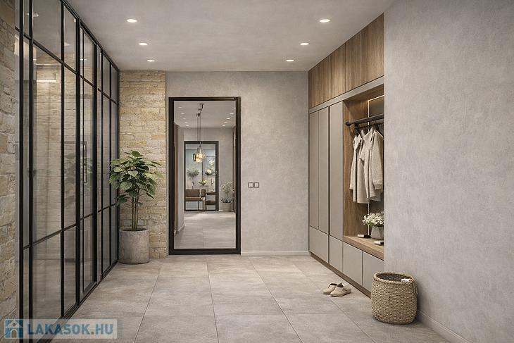 A lakás külön, kívülről megközelíthető, kétlakásos, modern épületben valósul meg, hőszivattyús fűtéssel, korszerű műszaki tartalommal.