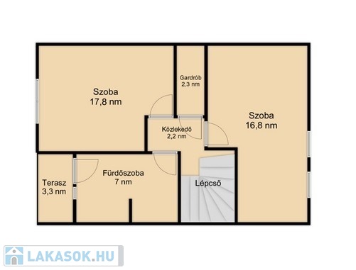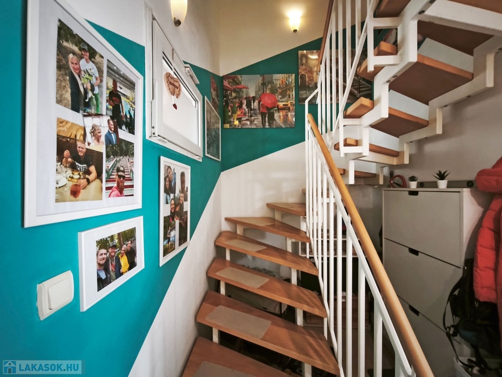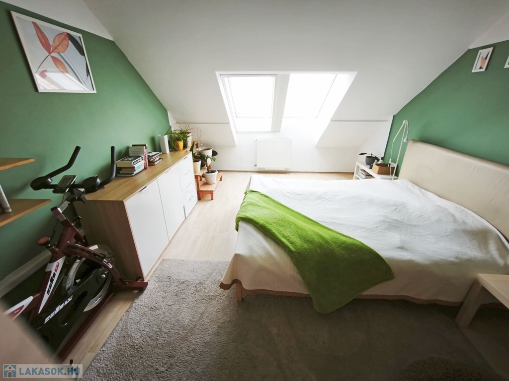 A felső szintre vezető lépcsőn a 2,2 nm-es közlekedőbe érkezünk, amiből jobbra nyílik a 16,8 nm-es laminált parkettás szoba, amit egy 2,3 nm-es jól kihasználható gardrób választ el a balra lévő 12,5 nm-es szintén laminált parkettás hálószobától.