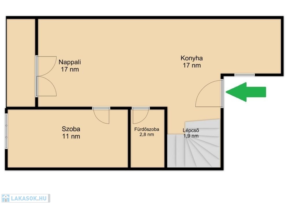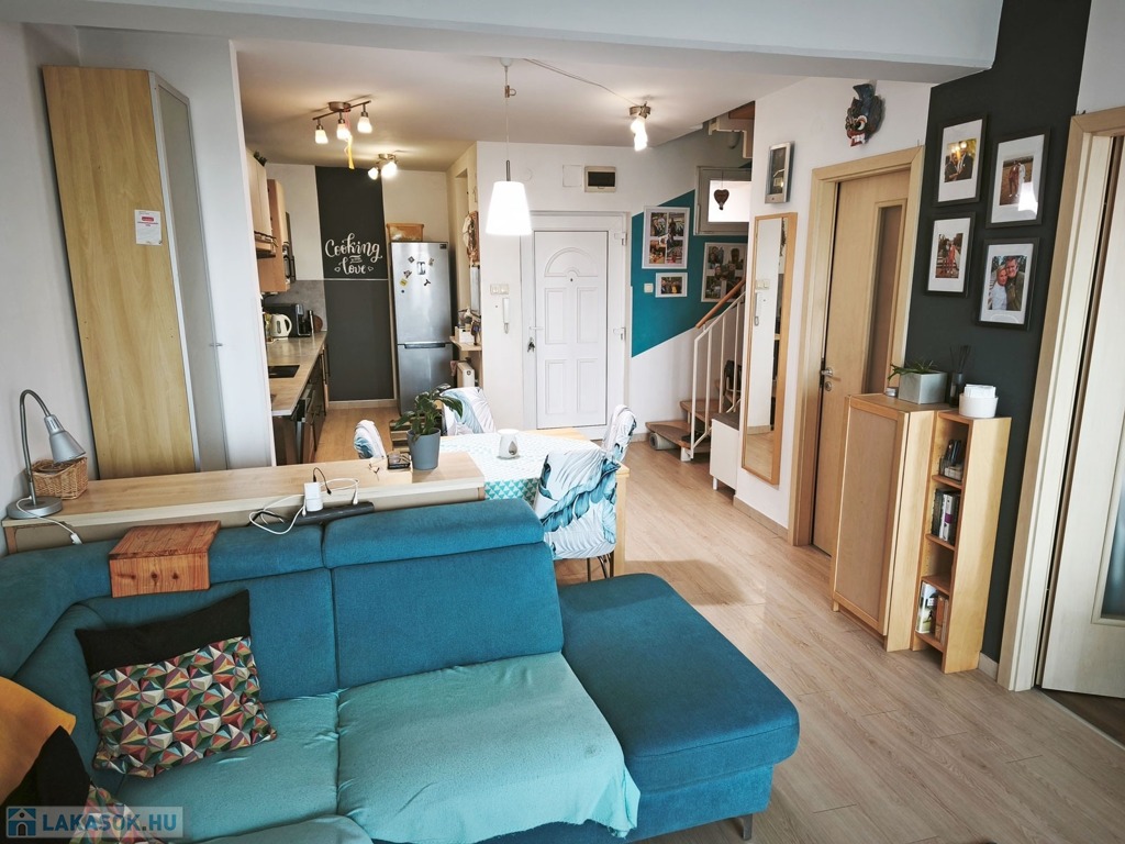 A lakás a biztonsági ráccsal ellátott folyosó végén helyezkedik el. A bejárattal szemben található egy saját 1,5 nm-es beépített külső tároló. A folyosó utolsó lakásaként a szintén biztonsági ráccsal védett bejárati ajtón belépve az alsó szinten a nagyon tágas 30 nm-es ízlésesen berendezett klímás, amerikai konyhás, nappaliba érkezünk, ami kényelmes teret biztosít a család mindennapi életéhez, közös időtöltéséhez. A konyha gépesített, ablakos , modern, bútorozott.