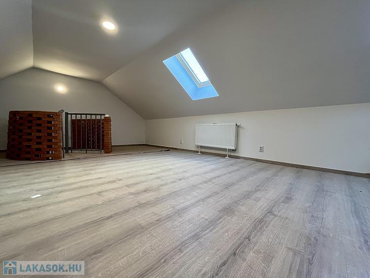 A felső szintre csigalépcső vezet, ahol egy tágas szoba és egy második fürdőszoba kapott helyet.