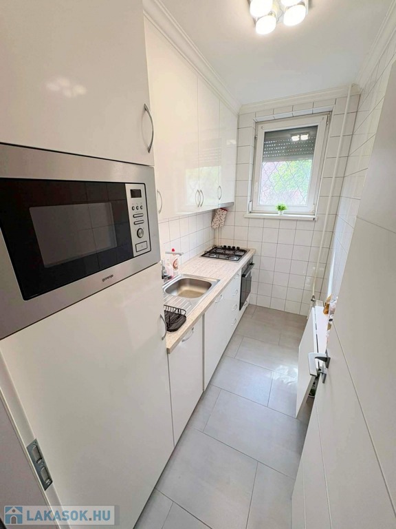 A gardrób helyiség teljesen új, egyedileg beépített bútorzatot kapott, amely praktikus és esztétikus tárolási megoldást kínál. A konyha ablakos, világos, újszerű állapotú konyhabútorral és beépített gépekkel felszerelt.