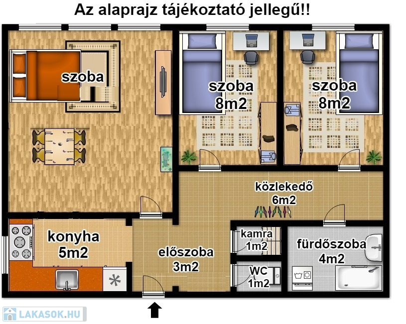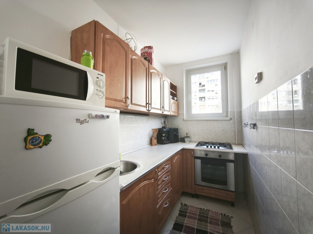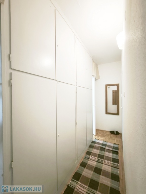 A rendezett, tiszta liftes lépcsőházból a több ponton záródó, biztonsági bejárati ajtón keresztül lehet bejutni. Belépve a lakásba az előtérből balra nyílik a gépesített, bútorozott ablakos tágas konyha ahova akár étkező asztalka is elfér, igény szerint. Jobbra nyílik a toalett, mellette egy polcokkal ellátott tároló ahol el tudjuk helyezni a nem minden nap használatos dolgokat. Szemben a tágas nappali szoba, keleti fekvésének köszönhetően napfényes, kellemes, komfortos érzetet nyújt. Innen jobbra a közlekedő egyik oldala beépített gardrób szekrénnyel van ellátva tovább növelve a tárolási felületeket. A közlekedőből nyílik a két fél szoba és szemben a kádas fürdőszoba, ahol a mosógép is helyet kapott.