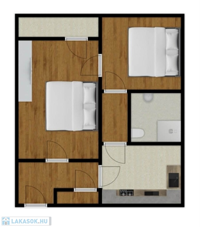 A tágas, világos lépcsőházból a lakásba lépve az előszobába érkezünk.Jobb oldalon található a szeparált, ablakos konyha, majd a kádas, szintén ablakos fürdőszoba következik. A konyhával szemben kis kamra, mellette praktikus gardróbszekrény került elhelyezésre. Az előszobából egyenesen továbbhaladva közelíthető meg a tágas nappali, amelyhez kellemes, délkeleti fekvésű loggia is kapcsolódik. A nappali jobb oldalán nyílik a kényelmes méretű hálószoba, amely a fürdőszobán keresztül az előszobából külön is megközelíthető.