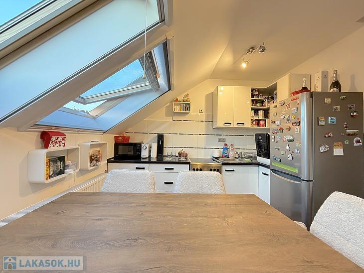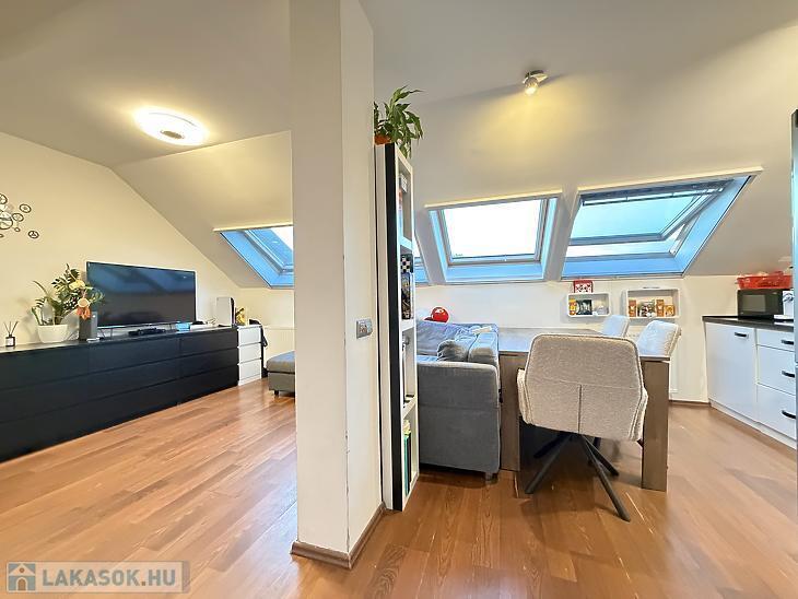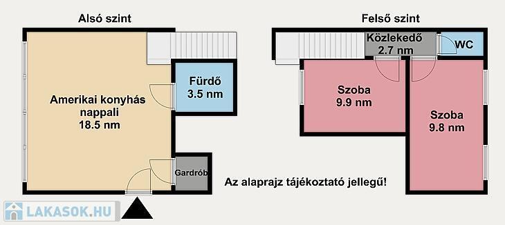 Az ingatlan nettó 47 nm, bruttó 58 nm alapterületű, praktikus elosztású: az alsó szinten amerikai konyhás nappali, a felső szinten pedig két külön nyíló hálószoba található. A házközponti fűtés egyedi méréssel működik, a klíma pedig a nyári hónapokban biztosítja a kellemes hőmérsékletet.