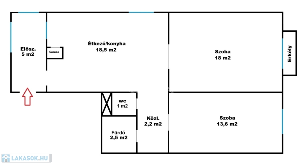 A lakás tulajdoni lap szerint 55 nm-es, 2 szobás. A tulajdonosok a társasháztól megvásároltak további 5 nm-t, mely előszobaként funkcionál.
