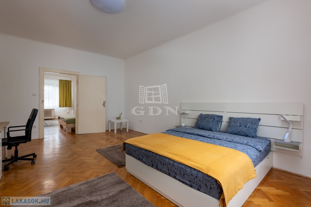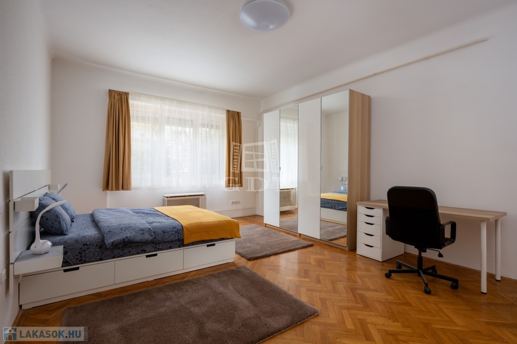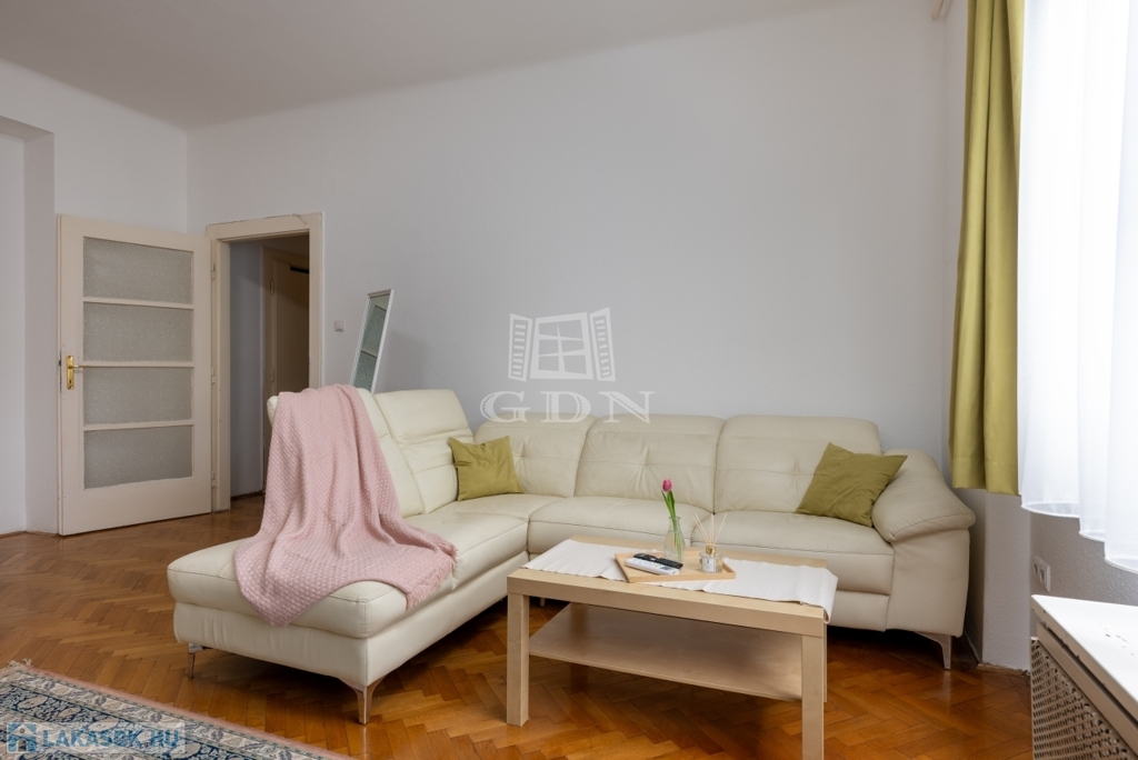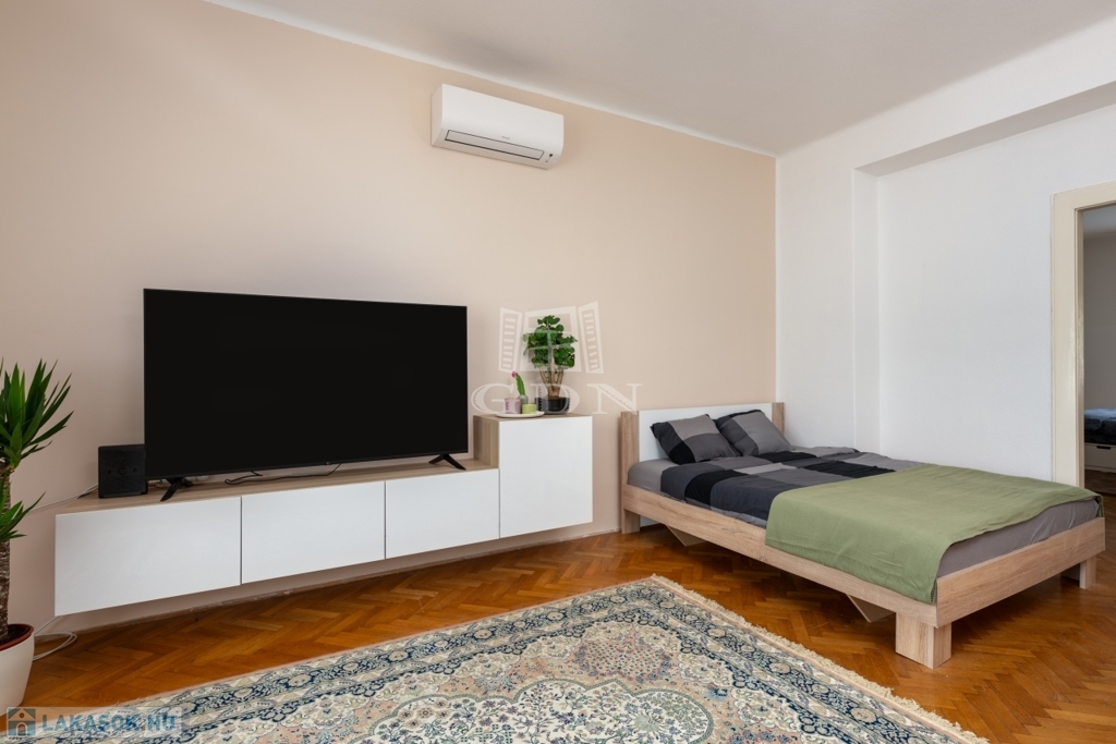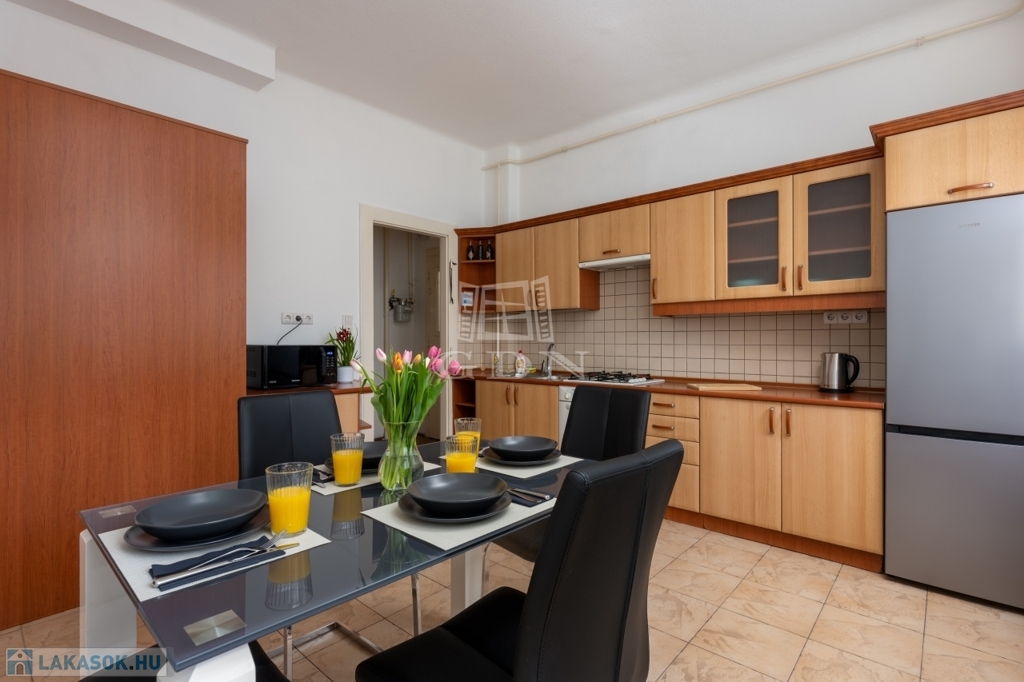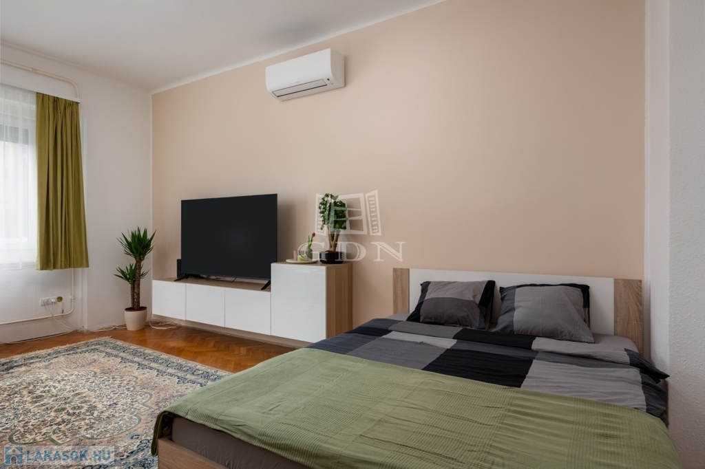 XIV. kerület központi elhelyezkedésű részén, kötött és szabadpályás tömegközlekedési eszközök, üzletek, közintézmények és egyéb szolgáltatások gyűrűjében, kis lakásszámú, rendezett állapotú, liftes társasházban, eladásra kínálok egy 81 m2-es, ablakos konyhás, jelenleg két külön és egymásból is nyíló szobás (könnyen 3 szobássá alakítható) műanyag-redőnyös nyílászárókkal szerelt, klimatizált lakást.