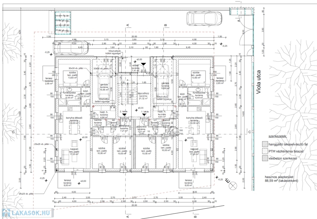 -Lakás alapterület:88,6 m² + garázs 16 m² + teraszok 8 m² és 2,85 m²