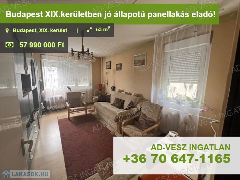 ELADÓ Budapest XIX. kerületének közkedvelt, zöldövezeti részén, az Arany János utcában egy jó állapotú, 9.emeleti, szélső, 53m2-es panellakás, liftes, alacsony fenntartási költségekkel.